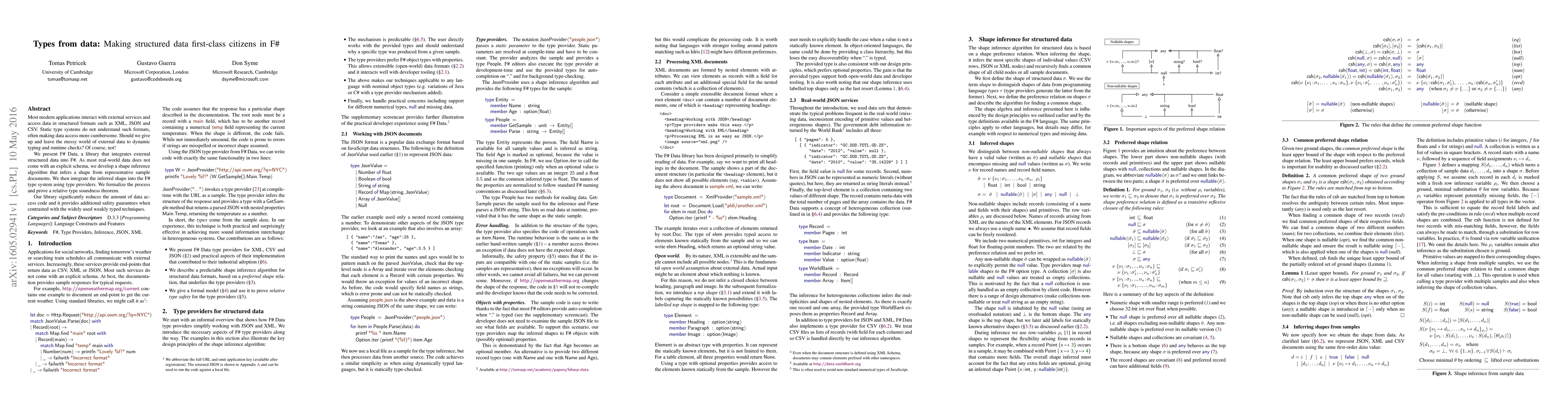 Most modern applications interact with external services and access data in structured formats such as XML, JSON and CSV. Static type systems do not understand such formats, often making data access more cumbersome. Should we give up and leave the messy world of external data to dynamic typing and runtime checks? Of course, not! We present F# Data, a library that integrates external structured data into F#. As most real-world data does not come with an explicit schema, we develop a shape inference algorithm that infers a shape from representative sample documents. We then integrate the inferred shape into the F# type system using type providers. We formalize the process and prove a relative type soundness theorem. Our library significantly reduces the amount of data access code and it provides additional safety guarantees when contrasted with the widely used weakly typed techniques.