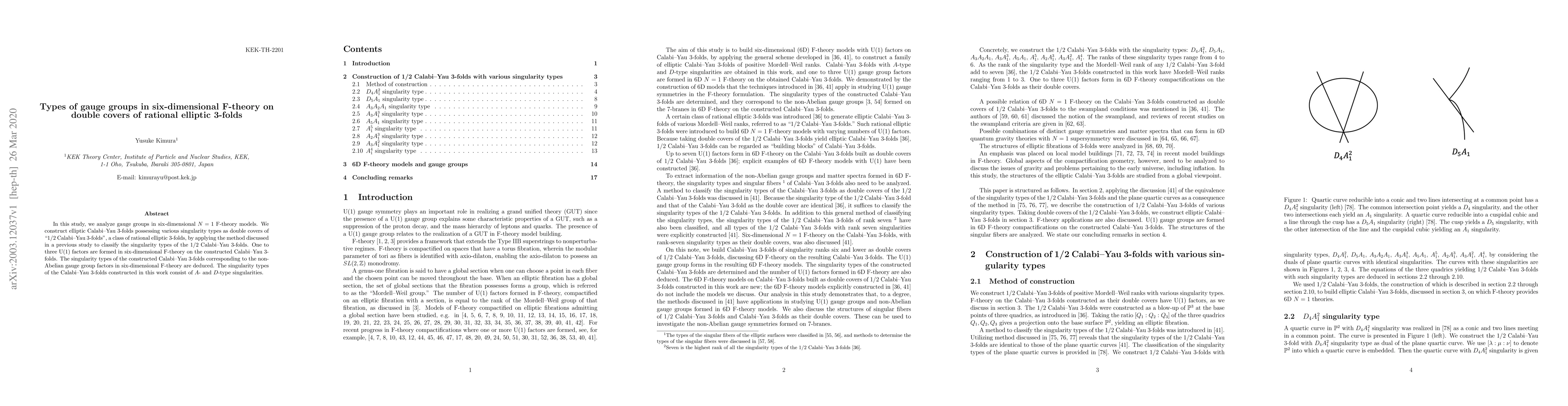 In this study, we analyze gauge groups in six-dimensional $N=1$ F-theory models. We construct elliptic Calabi-Yau 3-folds possessing various singularity types as double covers of "1/2 Calabi-Yau 3-folds", a class of rational elliptic 3-folds, by applying the method discussed in a previous study to classify the singularity types of the 1/2 Calabi-Yau 3-folds. One to three U(1) factors are formed in six-dimensional F-theory on the constructed Calabi-Yau 3-folds. The singularity types of the constructed Calabi-Yau 3-folds corresponding to the non-Abelian gauge group factors in six-dimensional F-theory are deduced. The singularity types of the Calabi-Yau 3-folds constructed in this work consist of $A$- and $D$-type singularities.