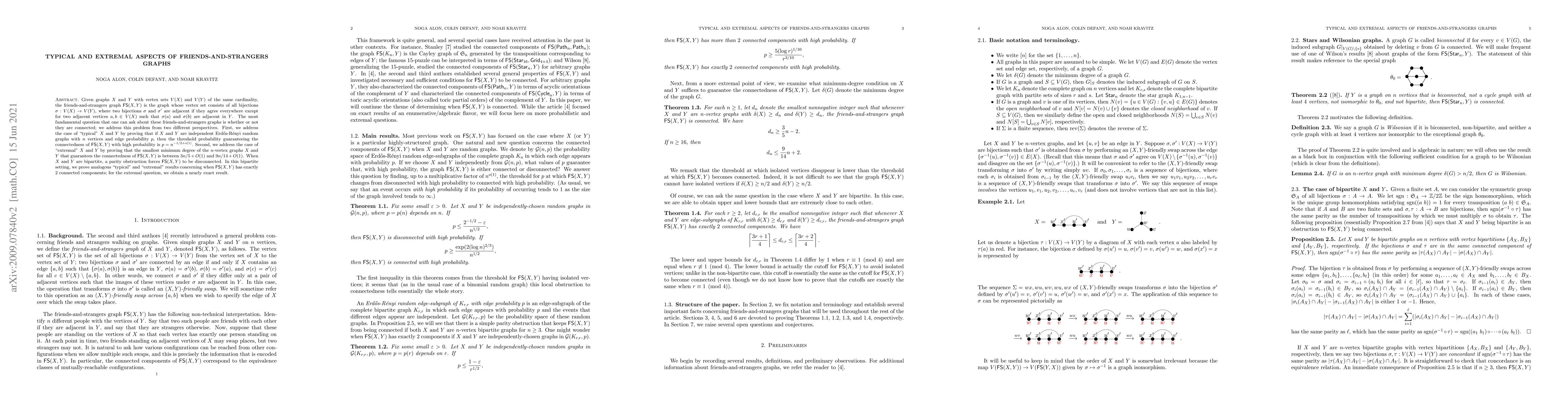 Given graphs $X$ and $Y$ with vertex sets $V(X)$ and $V(Y)$ of the same cardinality, the friends-and-strangers graph $\mathsf{FS}(X,Y)$ is the graph whose vertex set consists of all bijections $\sigma:V(X)\to V(Y)$, where two bijections $\sigma$ and $\sigma'$ are adjacent if they agree everywhere except for two adjacent vertices $a,b \in V(X)$ such that $\sigma(a)$ and $\sigma(b)$ are adjacent in $Y$. The most fundamental question that one can ask about these friends-and-strangers graphs is whether or not they are connected; we address this problem from two different perspectives. First, we address the case of "typical" $X$ and $Y$ by proving that if $X$ and $Y$ are independent Erd\H{o}s-R\'enyi random graphs with $n$ vertices and edge probability $p$, then the threshold probability guaranteeing the connectedness of $\mathsf{FS}(X,Y)$ with high probability is $p=n^{-1/2+o(1)}$. Second, we address the case of "extremal" $X$ and $Y$ by proving that the smallest minimum degree of the $n$-vertex graphs $X$ and $Y$ that guarantees the connectedness of $\mathsf{FS}(X,Y)$ is between $3n/5+O(1)$ and $9n/14+O(1)$. When $X$ and $Y$ are bipartite, a parity obstruction forces $\mathsf{FS}(X,Y)$ to be disconnected. In this bipartite setting, we prove analogous "typical" and "extremal" results concerning when $\mathsf{FS}(X,Y)$ has exactly $2$ connected components; for the extremal question, we obtain a nearly exact result.