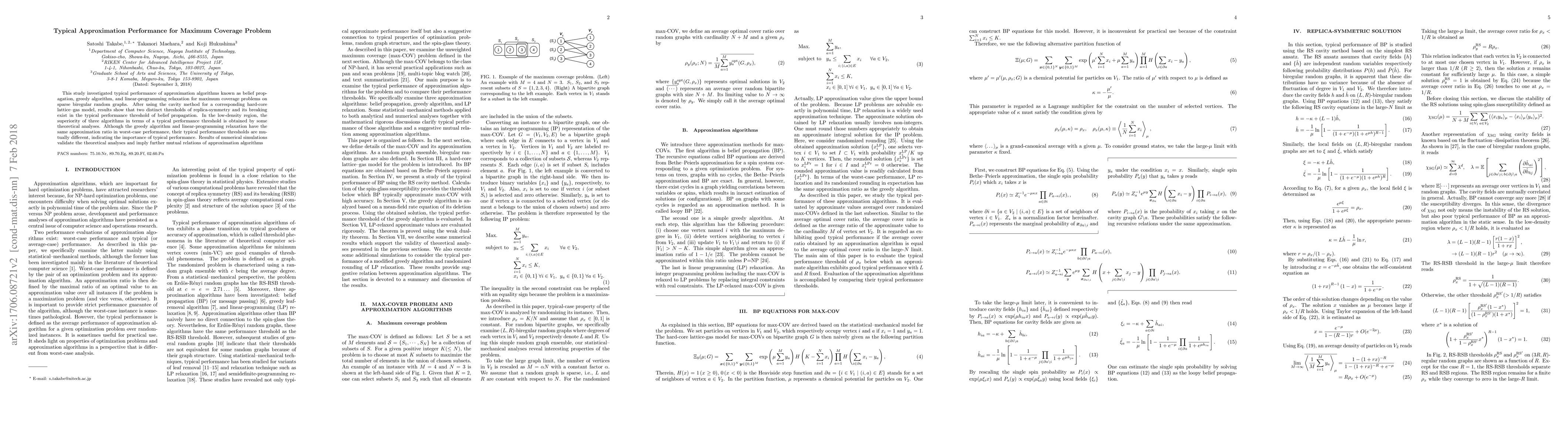 This study investigated typical performance of approximation algorithms known as belief propagation, greedy algorithm, and linear-programming relaxation for maximum coverage problems on sparse biregular random graphs. After using the cavity method for a corresponding hard-core lattice--gas model, results show that two distinct thresholds of replica-symmetry and its breaking exist in the typical performance threshold of belief propagation. In the low-density region, the superiority of three algorithms in terms of a typical performance threshold is obtained by some theoretical analyses. Although the greedy algorithm and linear-programming relaxation have the same approximation ratio in worst-case performance, their typical performance thresholds are mutually different, indicating the importance of typical performance. Results of numerical simulations validate the theoretical analyses and imply further mutual relations of approximation algorithms.