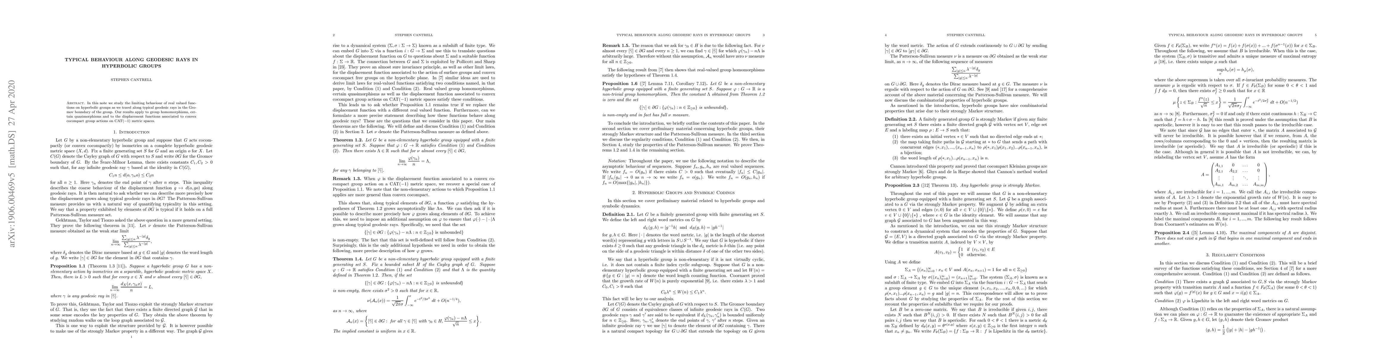 In this note we study the limiting behaviour of real valued functions on hyperbolic groups as we travel along typical geodesic rays in the Gromov boundary of the group. Our results apply to group homomorphisms, certain quasimorphisms and to the displacement functions associated to convex cocompact group actions on CAT$(-1)$ metric spaces.