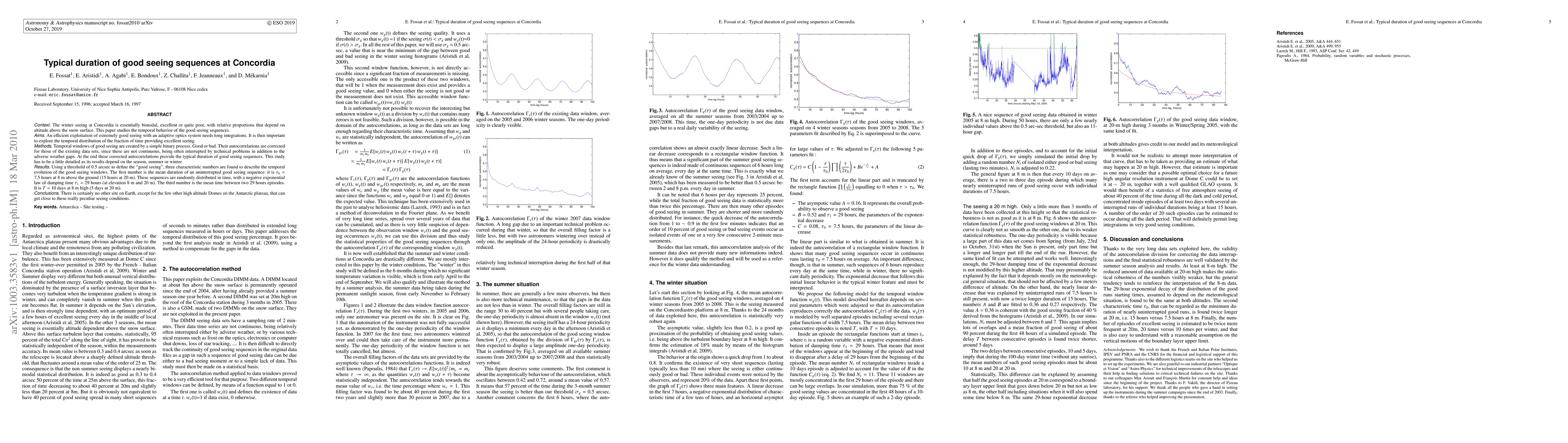 Context: The winter seeing at Concordia is essentially bimodal, excellent or quite poor, with relative proportions that depend on altitude above the snow surface. This paper studies the temporal behavior of the good seeing sequences. Aims: An efficient exploitation of extremely good seeing with an adaptive optics system needs long integrations. It is then important to explore the temporal distribution of the fraction of time providing excellent seeing. Methods: Temporal windows of good seeing are created by a simple binary process. Good or bad. Their autocorrelations are corrected for those of the existing data sets, since these are not continuous, being often interrupted by technical problems in addition to the adverse weather gaps. At the end these corrected autocorrelations provide the typical duration of good seeing sequences. This study has to be a little detailed as its results depend on the season, summer or winter. Results: Using a threshold of 0.5 arcsec to define the "good seeing", three characteristic numbers are found to describe the temporal evolution of the good seeing windows. The first number is the mean duration of an uninterrupted good seeing sequence: it is $\tau_0=7.5$ hours at 8 m above the ground (15 hours at 20 m). These sequences are randomly distributed in time, with a negative exponential law of damping time $\tau_1=29$ hours (at elevation 8 m and 20 m). The third number is the mean time between two 29 hours episodes. It is T=10 days at 8 m high (5 days at 20 m).