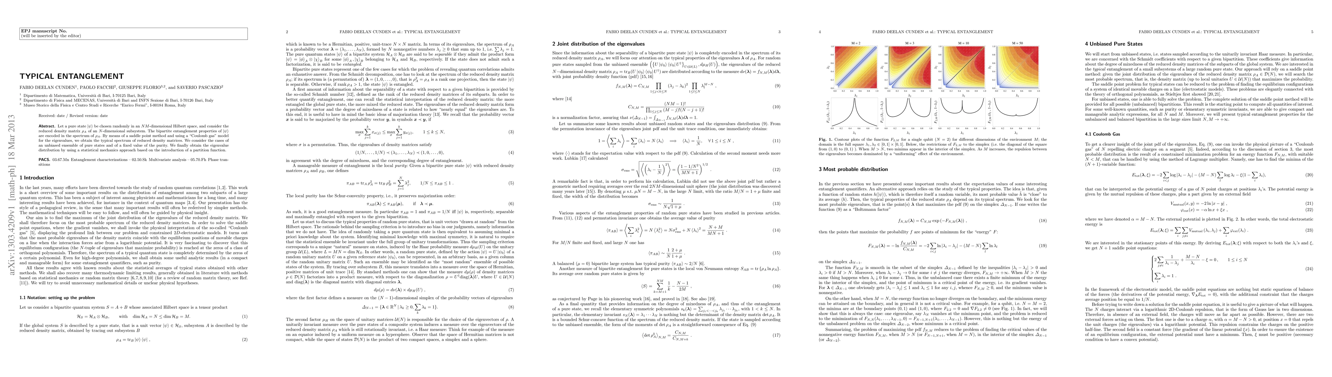 This paper investigates the typical entanglement properties of random pure states in an NM-dimensional Hilbert space, focusing on the spectrum of reduced density matrices for an N-dimensional subsystem. Using a saddle point method and a Coulomb gas model, the authors derive the typical eigenvalue distribution for both unbiased ensembles and fixed purity states through a statistical mechanics approach.