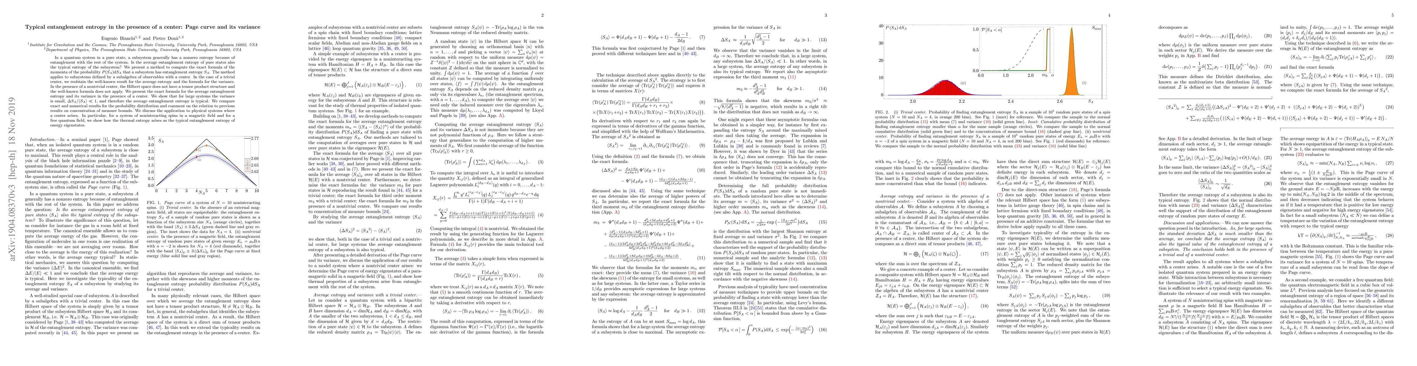 In a quantum system in a pure state, a subsystem generally has a nonzero entropy because of entanglement with the rest of the system. Is the average entanglement entropy of pure states also the typical entropy of the subsystem? We present a method to compute the exact formula of the momenta of the probability $P(S_A) \mathrm{d}S_A$ that a subsystem has entanglement entropy $S_A$. The method applies to subsystems defined by a subalgebra of observables with a center. In the case of a trivial center, we reobtain the well-known result for the average entropy and the formula for the variance. In the presence of a nontrivial center, the Hilbert space does not have a tensor product structure and the well-known formula does not apply. We present the exact formula for the average entanglement entropy and its variance in the presence of a center. We show that for large systems the variance is small, $\Delta S_A/\langle{S_{A}}\rangle\ll 1$, and therefore the average entanglement entropy is typical. We compare exact and numerical results for the probability distribution and comment on the relation to previous results on concentration of measure bounds. We discuss the application to physical systems where a center arises. In particular, for a system of noninteracting spins in a magnetic field and for a free quantum field, we show how the thermal entropy arises as the typical entanglement entropy of energy eigenstates.