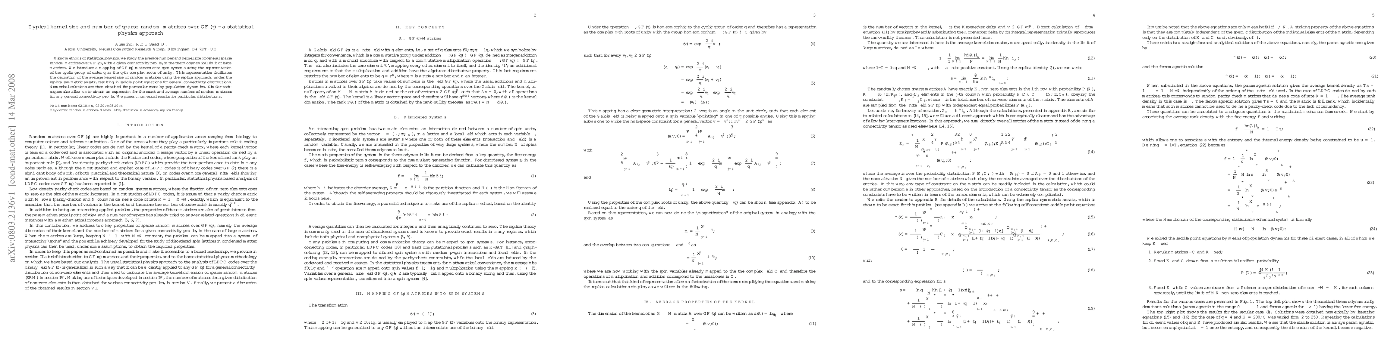 Introduced a new mapping of Galois field matrices to spin systems and an alternative method for summing over random matrices, allowing for factorization of constraints and simplification of kernel and matrix number calculations under various connectivity profiles.