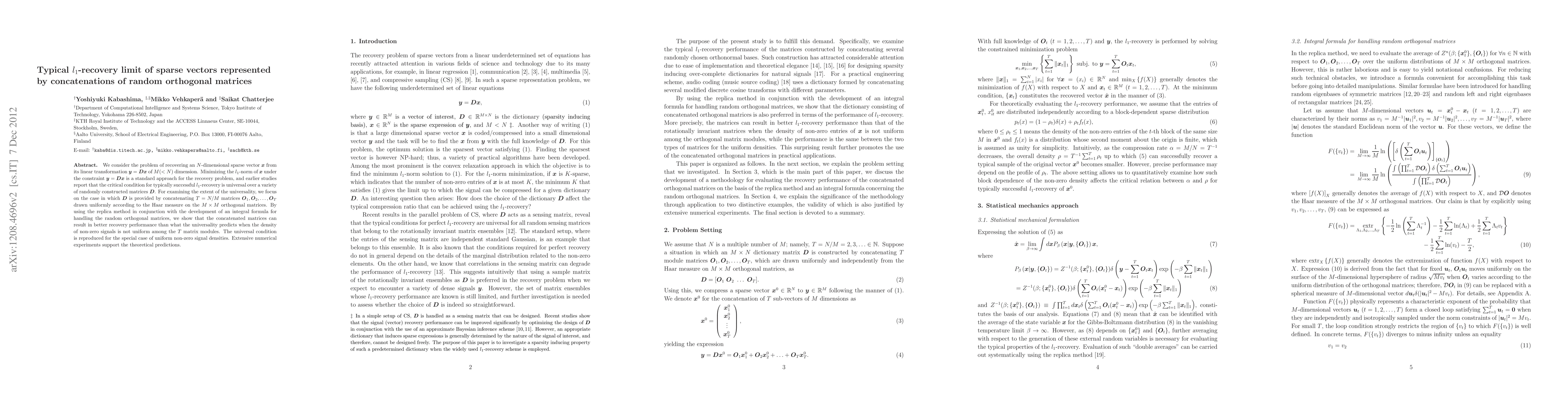 We consider the problem of recovering an $N$-dimensional sparse vector $\vm{x}$ from its linear transformation $\vm{y}=\vm{D} \vm{x}$ of $M(< N)$ dimension. Minimizing the $l_{1}$-norm of $\vm{x}$ under the constraint $\vm{y} = \vm{D} \vm{x}$ is a standard approach for the recovery problem, and earlier studies report that the critical condition for typically successful $l_1$-recovery is universal over a variety of randomly constructed matrices $\vm{D}$. For examining the extent of the universality, we focus on the case in which $\vm{D}$ is provided by concatenating $\nb=N/M$ matrices $\vm{O}_{1}, \vm{O}_{2},..., \vm{O}_\nb$ drawn uniformly according to the Haar measure on the $M \times M$ orthogonal matrices. By using the replica method in conjunction with the development of an integral formula for handling the random orthogonal matrices, we show that the concatenated matrices can result in better recovery performance than what the universality predicts when the density of non-zero signals is not uniform among the $\nb$ matrix modules. The universal condition is reproduced for the special case of uniform non-zero signal densities. Extensive numerical experiments support the theoretical predictions.