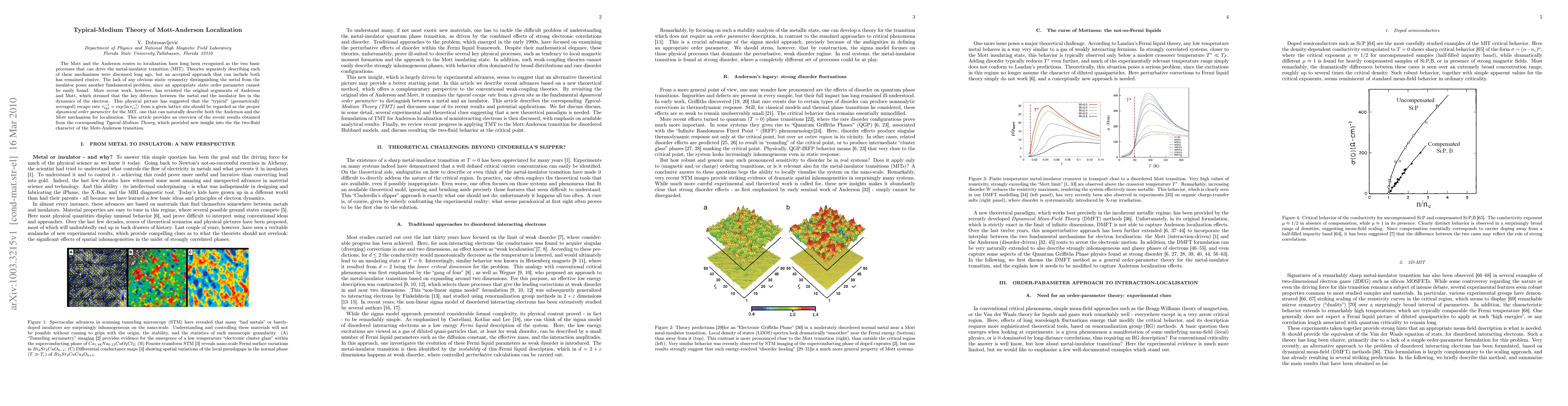 This paper introduces the Typical-Medium Theory to unify the Mott and Anderson localization mechanisms driving metal-insulator transitions, proposing the "typical" escape rate as a new dynamical order parameter. Recent findings support the theory’s ability to describe both localization mechanisms effectively.