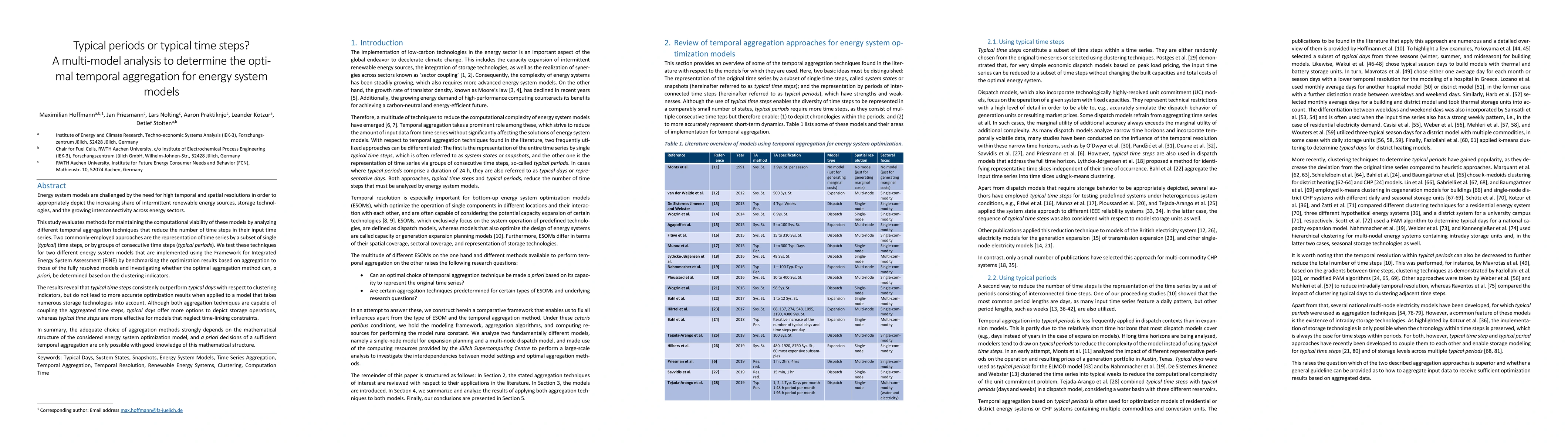 Energy system models are challenged by the need for high temporal and spatial resolutions in or-der to appropriately depict the increasing share of intermittent renewable energy sources, storage technologies, and the growing interconnectivity across energy sectors. This study evaluates methods for maintaining the computational viability of these models by ana-lyzing different temporal aggregation techniques that reduce the number of time steps in their in-put time series. Two commonly-employed approaches are the representation of time series by a subset of single (typical) time steps, or by groups of consecutive time steps (typical periods). We test these techniques for two different energy system models that are implemented using the Frame-work for Integrated Energy System Assessment (FINE) by benchmarking the optimization results based on aggregation to those of the fully resolved models and investigating whether the optimal aggregation method can, a priori, be determined based on the clustering indicators. The results reveal that typical time steps consistenly outperform typical days with respect to cluster-ing indicators, but do not lead to more accurate optimization results when applied to a model that takes numerous storage technologies into account. Although both aggregation techniques are ca-pable of coupling the aggregated time steps, typical days offer more options to depict storage oper-ations, whereas typical time steps are more effective for models that neglect time-linking con-straints. In summary, the adequate choice of aggregation methods strongly depends on the mathematical structure of the considered energy system optimization model, and a priori decisions of a sufficient temporal aggregation are only possible with good knowledge of this mathematical structure.