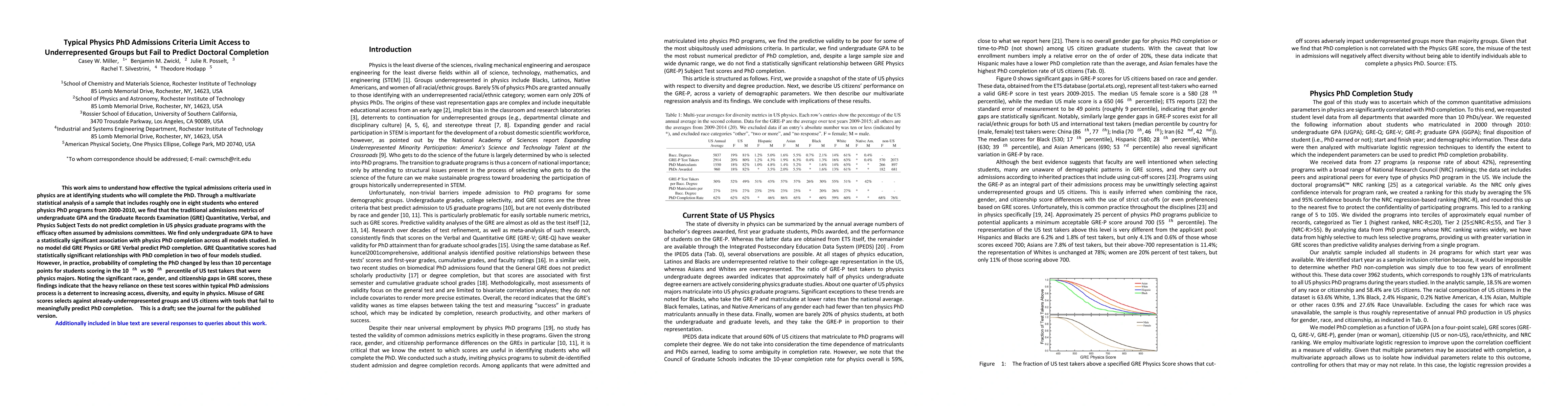 This study reveals that traditional physics PhD admissions criteria, including GRE scores and undergraduate GPA, poorly predict doctoral completion. Only undergraduate GPA showed a statistically significant relationship with PhD completion, while GRE scores had minimal predictive power, highlighting the inefficacy and inequity of current admissions practices in diversifying the physics PhD population.