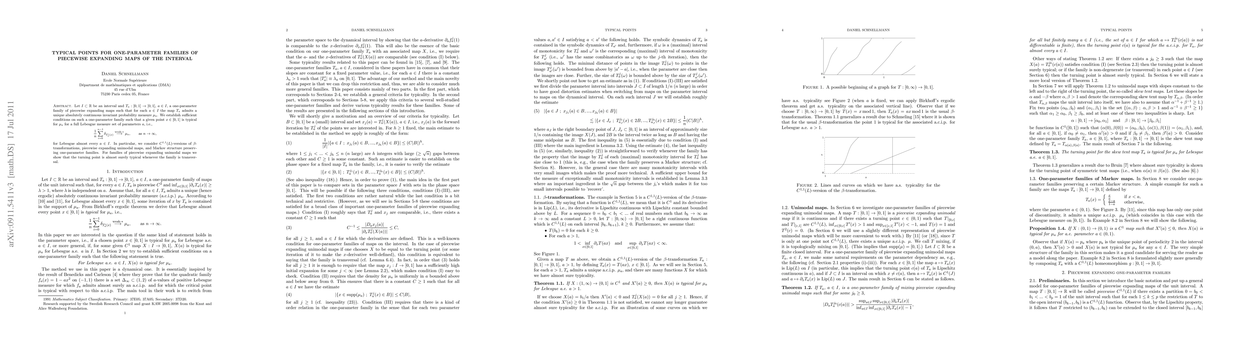 This paper investigates sufficient conditions for points in piecewise expanding maps to exhibit typical behavior under a one-parameter family of maps, demonstrating that certain points are typical for a full Lebesgue measure set of parameters. It focuses on $C^{1,1}(L)$-versions of $\beta$-transformations, skew tent maps, and Markov structure preserving families, showing that the turning point is almost surely typical for skew tent maps.