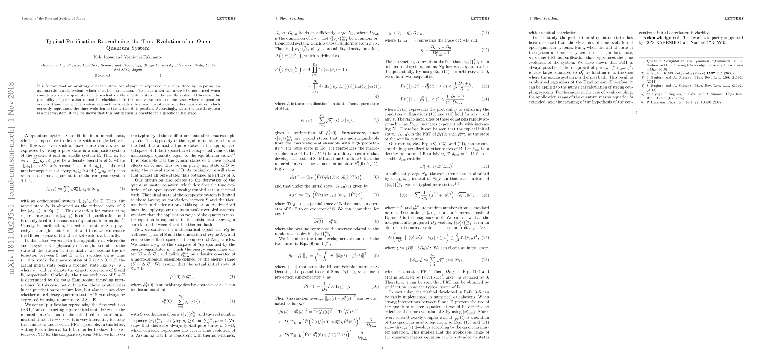 Researchers investigated if purification of an open quantum system can reproduce its time evolution when interacting with a macroscopic ancilla system. They found that purification is possible for specific initial states.