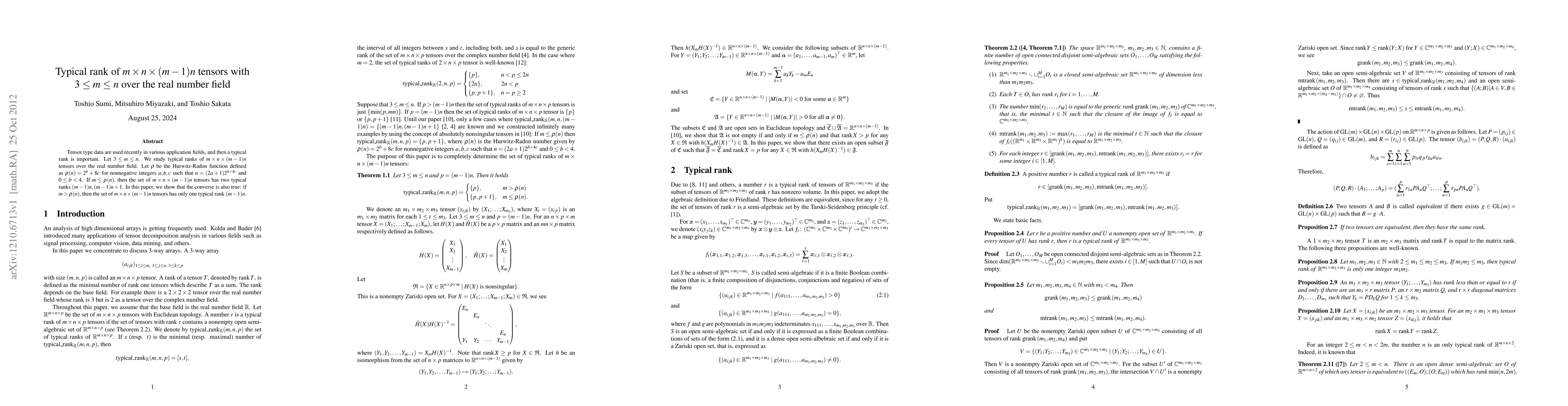 Tensor type data are used recently in various application fields, and then a typical rank is important. Let $3\leq m\leq n$. We study typical ranks of $m\times n\times (m-1)n$ tensors over the real number field. Let $\rho$ be the Hurwitz-Radon function defined as $\rho(n)=2^b+8c$ for nonnegative integers $a,b,c$ such that $n=(2a+1)2^{b+4c}$ and $0\leq b<4$. If $m \leq \rho(n)$, then the set of $m\times n\times (m-1)n$ tensors has two typical ranks $(m-1)n,(m-1)n+1$. In this paper, we show that the converse is also true: if $m > \rho(n)$, then the set of $m\times n\times (m-1)n$ tensors has only one typical rank $(m-1)n$.