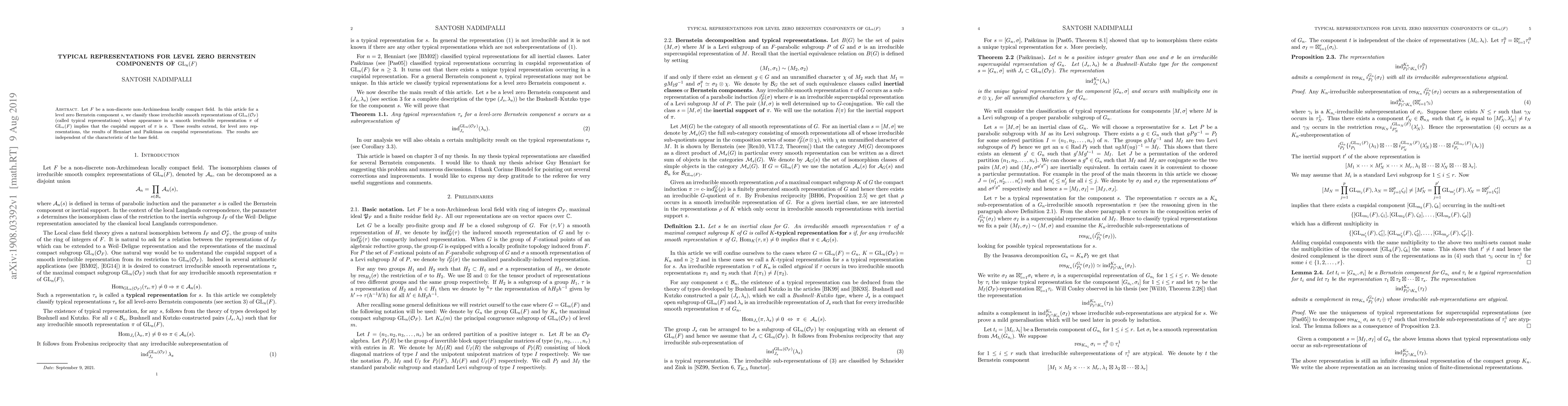 This paper classifies typical irreducible smooth representations of ${\rm GL}_n(\mathbb{Z}_F)$ for level zero Bernstein components, ensuring that their presence in a smooth irreducible representation implies the cuspidal support is the given component. These results extend findings on cuspidal representations and are characteristic-independent.