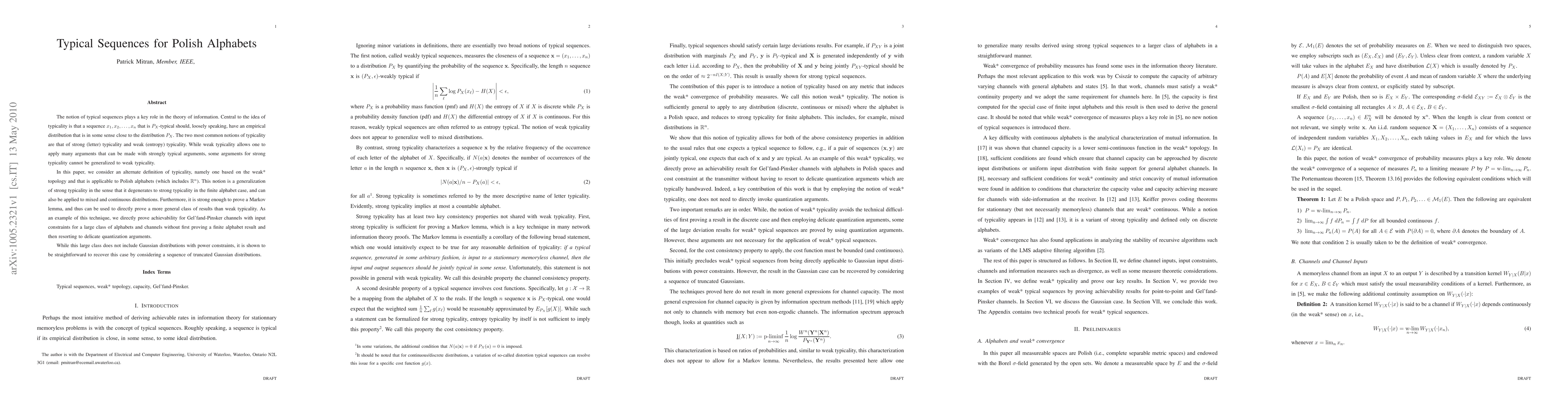 The notion of typical sequences plays a key role in the theory of information. Central to the idea of typicality is that a sequence $x_1, x_2, ..., x_n$ that is $P_X$-typical should, loosely speaking, have an empirical distribution that is in some sense close to the distribution $P_X$. The two most common notions of typicality are that of strong (letter) typicality and weak (entropy) typicality. While weak typicality allows one to apply many arguments that can be made with strongly typical arguments, some arguments for strong typicality cannot be generalized to weak typicality. In this paper, we consider an alternate definition of typicality, namely one based on the weak* topology and that is applicable to Polish alphabets (which includes $\reals^n$). This notion is a generalization of strong typicality in the sense that it degenerates to strong typicality in the finite alphabet case, and can also be applied to mixed and continuous distributions. Furthermore, it is strong enough to prove a Markov lemma, and thus can be used to directly prove a more general class of results than weak typicality. As an example of this technique, we directly prove achievability for Gel'fand-Pinsker channels with input constraints for a large class of alphabets and channels without first proving a finite alphabet result and then resorting to delicate quantization arguments. While this large class does not include Gaussian distributions with power constraints, it is shown to be straightforward to recover this case by considering a sequence of truncated Gaussian distributions.