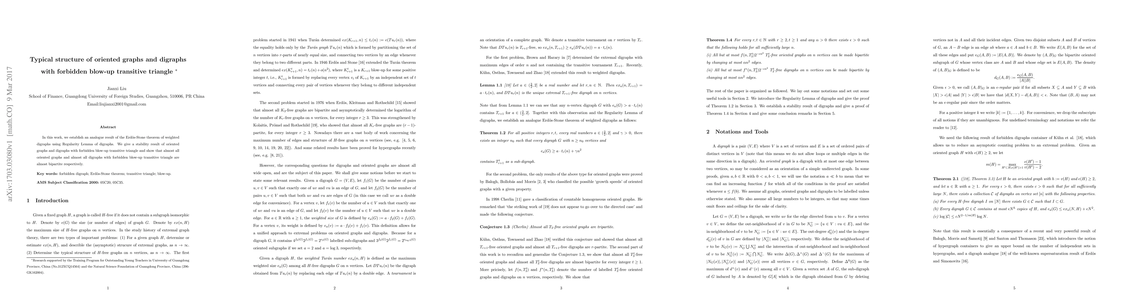 This paper establishes an analogue of the Erdős-Stone theorem for weighted digraphs using the Regularity Lemma, proving that almost all oriented graphs and digraphs with forbidden blow-up transitive triangles are almost bipartite.