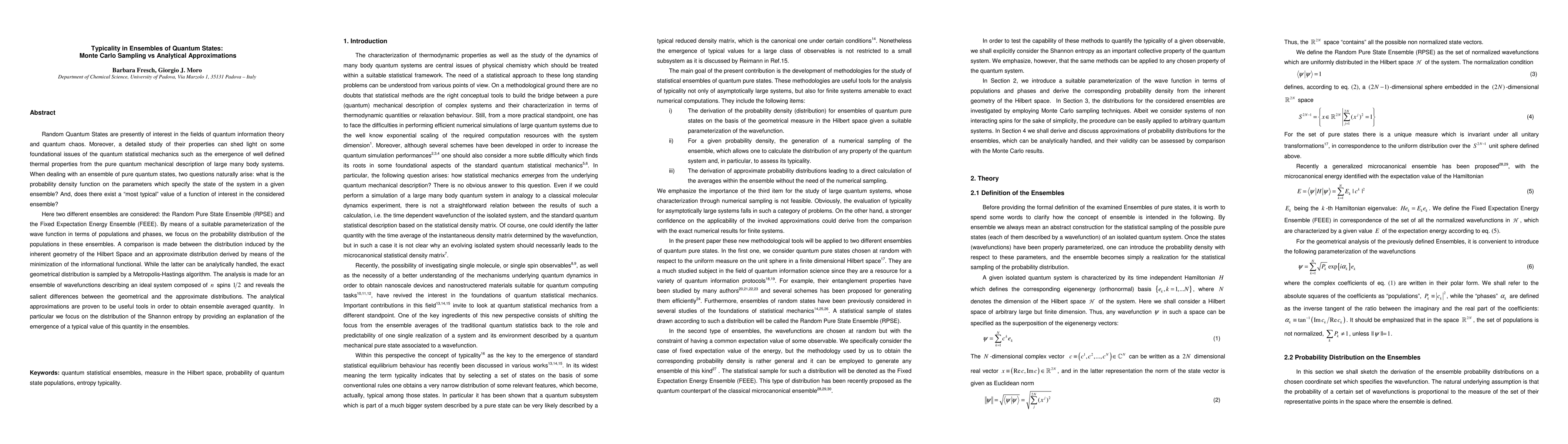 Random Quantum States are presently of interest in the fields of quantum information theory and quantum chaos. Moreover, a detailed study of their properties can shed light on some foundational issues of the quantum statistical mechanics such as the emergence of well defined thermal properties from the pure quantum mechanical description of large many body systems. When dealing with an ensemble of pure quantum states, two questions naturally arise: what is the probability density function on the parameters which specify the state of the system in a given ensemble? And, does there exist a most typical value of a function of interest in the considered ensemble? Here two different ensembles are considered: the Random Pure State Ensemble (RPSE) and the Fixed Expectation Energy Ensemble (FEEE). By means of a suitable parameterization of the wave function in terms of populations and phases, we focus on the probability distribution of the populations in such ensembles. A comparison is made between the distribution induced by the inherent geometry of the Hilbert Space and an approximate distribution derived by means of the minimization of the informational functional. While the latter can be analytically handled, the exact geometrical distribution is sampled by a Metropolis-Hastings algorithm. The analysis is made for an ensemble of wavefunctions describing an ideal system composed of n spins 1/2 and reveals the salient differences between the geometrical and the approximate distributions. The analytical approximations are proven to be useful tools in order to obtain ensemble averaged quantity. In particular we focus on the distribution of the Shannon entropy by providing an explanation of the emergence of a typical value of this quantity in the ensembles.