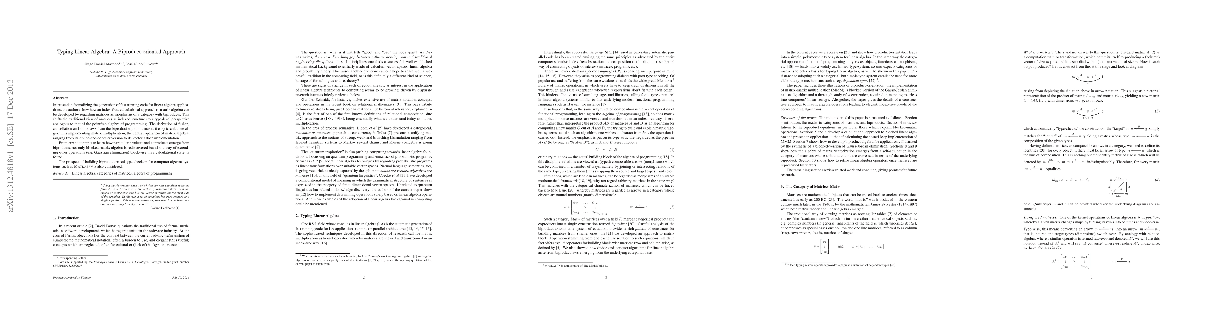 This research presents a novel, type-level perspective on matrix algebra, viewing matrices as category morphisms with biproducts, facilitating the generation of efficient code for linear algebra applications. It derives key laws from biproduct equations, enabling easy calculation of matrix multiplication algorithms and blockwise extension of operations like Gaussian elimination.