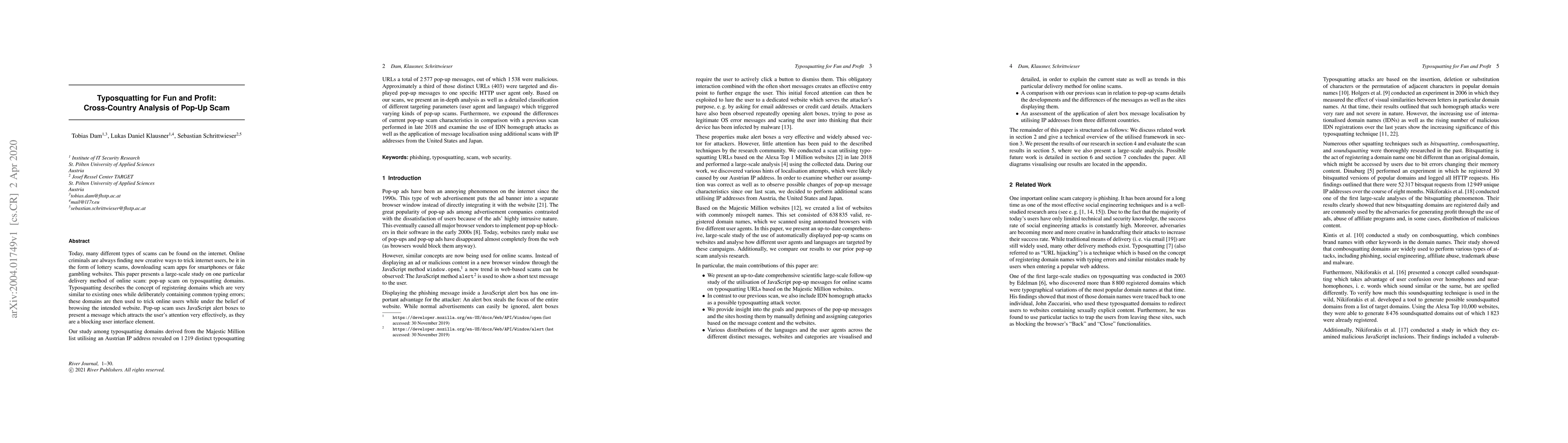 This paper investigates pop-up scams delivered via typosquatting domains, finding 1538 malicious pop-ups among 2577 total from 1219 distinct URLs. It analyzes targeting parameters like user agent and language, revealing differences from 2018 and exploring IDN homograph attacks and message localization.