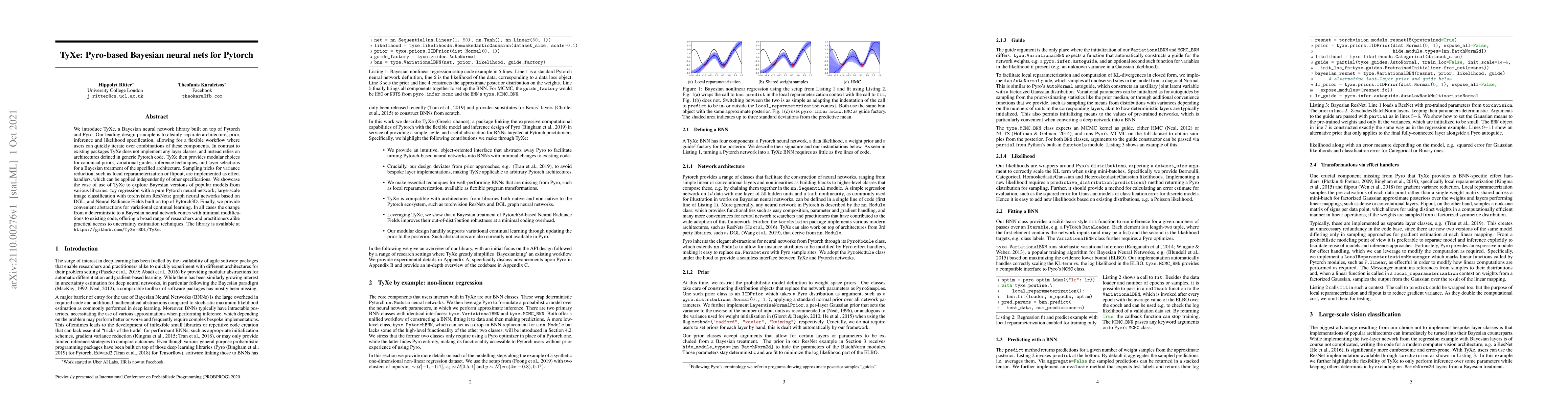 TyXe is a Bayesian neural network library for Pytorch and Pyro that separates architecture, prior, inference, and likelihood, allowing flexible model iterations. It provides modular components for priors, variational guides, and inference techniques, enabling easy Bayesian treatment of various neural network architectures with minimal code changes.