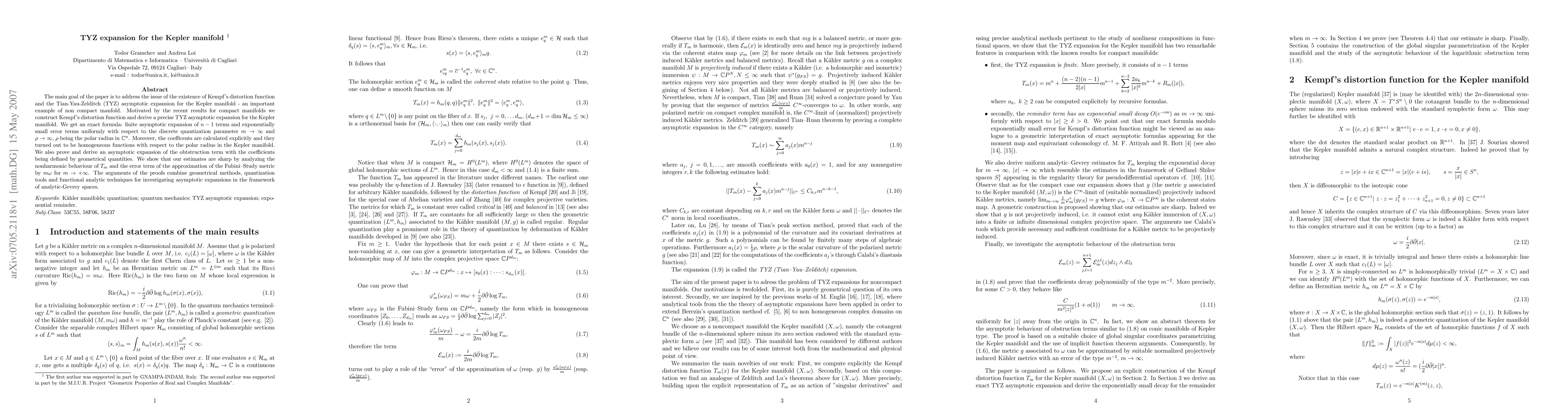 The main goal of the paper is to address the issue of the existence of Kempf's distortion function and the Tian-Yau-Zelditch (TYZ) asymptotic expansion for the Kepler manifold - an important example of non compact manfold. Motivated by the recent results for compact manifolds we construct Kempf's distortion function and derive a precise TYZ asymptotic expansion for the Kepler manifold. We get an exact formula: finite asymptotic expansion of $n-1$ terms and exponentially small error terms uniformly with respect to the discrete quantization parameter $m\to \infty $ and $\rho \to \infty$, $\rho$ being the polar radius in $\C^n$. Moreover, the coefficents are calculated explicitly and they turned out to be homogeneous functions with respect to the polar radius in the Kepler manifold. We also prove and derive an asymptotic expansion of the obtstruction term with the coefficients being defined by geometrical quantities. We show that our estimates are sharp by analyzing the nonharmonic behaviour of $T_m$ and the error term of the approximation of the Fubini--Study metric by $m\omega$ for $m\to +\infty$. The arguments of the proofs combine geometrical methods, quantization tools and functional analytic techniques for investigating asymptotic expansions in the framework of analytic-Gevrey spaces.