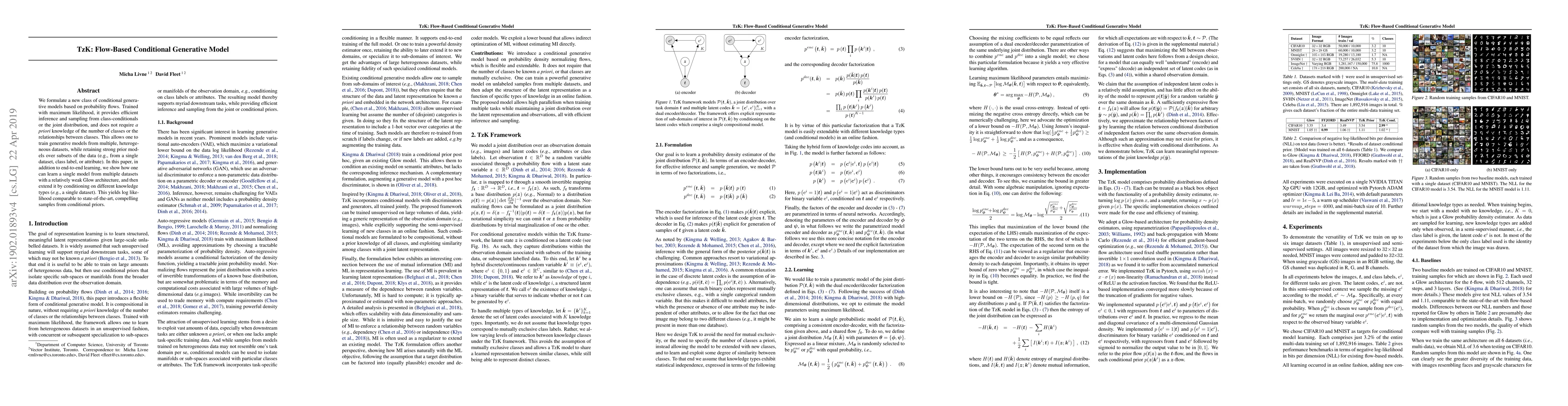 This paper introduces TzK, a flow-based conditional generative model that efficiently infers and samples from class-conditionals without prior class knowledge. It demonstrates training a single model from multiple datasets, leveraging a simple Glow architecture, and conditioning on various knowledge types to achieve state-of-the-art log likelihoods and high-quality generative samples.