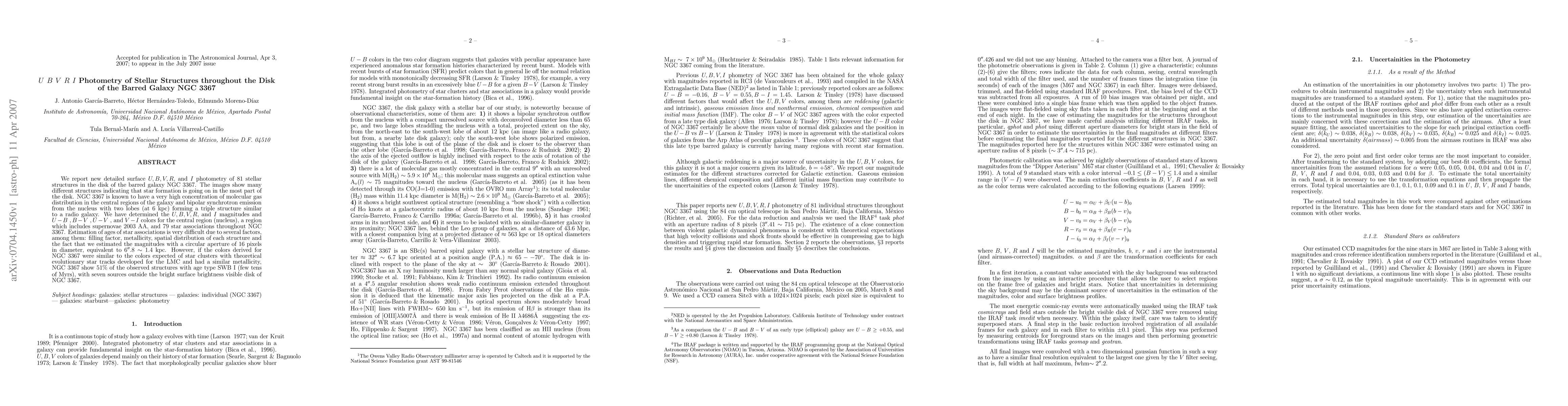 We report new detailed surface U, B, V, R, and I photometry of 81 stellar structures in the disk of the barred galaxy NGC 3367. The images show many different structures indicating that star formation is going on in the most part of the disk. NGC 3367 is known to have a very high concentration of molecular gas distribution in the central regions of the galaxy and bipolar synchrotron emission from the nucleus with two lobes (at 6 kpc) forming a triple structure similar to a radio galaxy. We have determined the U, B, V, R, and I magnitudes and U - B, B - V, U - V, and V - I colors for the central region (nucleus), a region which includes supernovae 2003 AA, and 79 star associations throughout NGC 3367. Estimation of ages of star associations is very difficult due to several factors, among them: filling factor, metallicity, spatial distribution of each structure and the fact that we estimated the magnitudes with a circular aperture of 16 pixels in diameter, equivalent to $6''.8\sim1.4$ kpc. However, if the colors derived for NGC 3367 were similar to the colors expected of star clusters with theoretical evolutionary star tracks developed for the LMC and had a similar metallicity, NGC 3367 show 51 percent of the observed structures with age type SWB I (few tens of Myrs), with seven sources outside the bright surface brightness visible disk of NGC 3367.