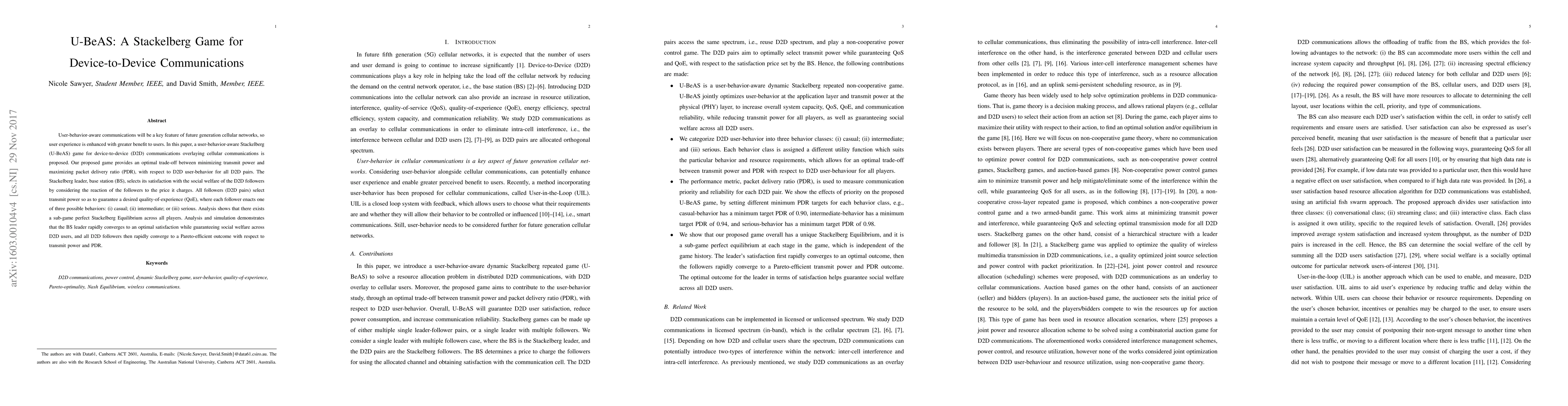 This paper proposes a U-BeAS Stackelberg game for optimizing device-to-device (D2D) communications, balancing transmit power and packet delivery ratio. The base station acts as the Stackelberg leader, optimizing social welfare while followers (D2D pairs) choose transmit power based on their quality-of-experience behaviors.