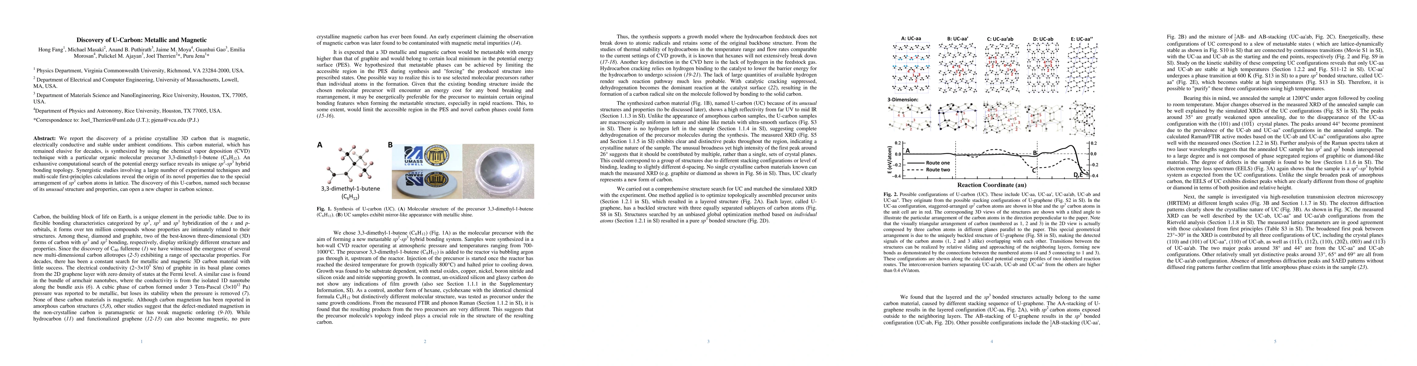 We report the discovery of a pristine crystalline 3D carbon that is magnetic, electrically conductive and stable under ambient conditions. This carbon material, which has remained elusive for decades, is synthesized by using the chemical vapor deposition (CVD) technique with a particular organic molecular precursor 3,3-dimethyl-1-butene (C6H12). An exhaustive computational search of the potential energy surface reveals its unique sp2-sp3 hybrid bonding topology. Synergistic studies involving a large number of experimental techniques and multi-scale first-principles calculations reveal the origin of its novel properties due to the special arrangement of sp2 carbon atoms in lattice. The discovery of this U-carbon, named such because of its unusual structure and properties, can open a new chapter in carbon science.