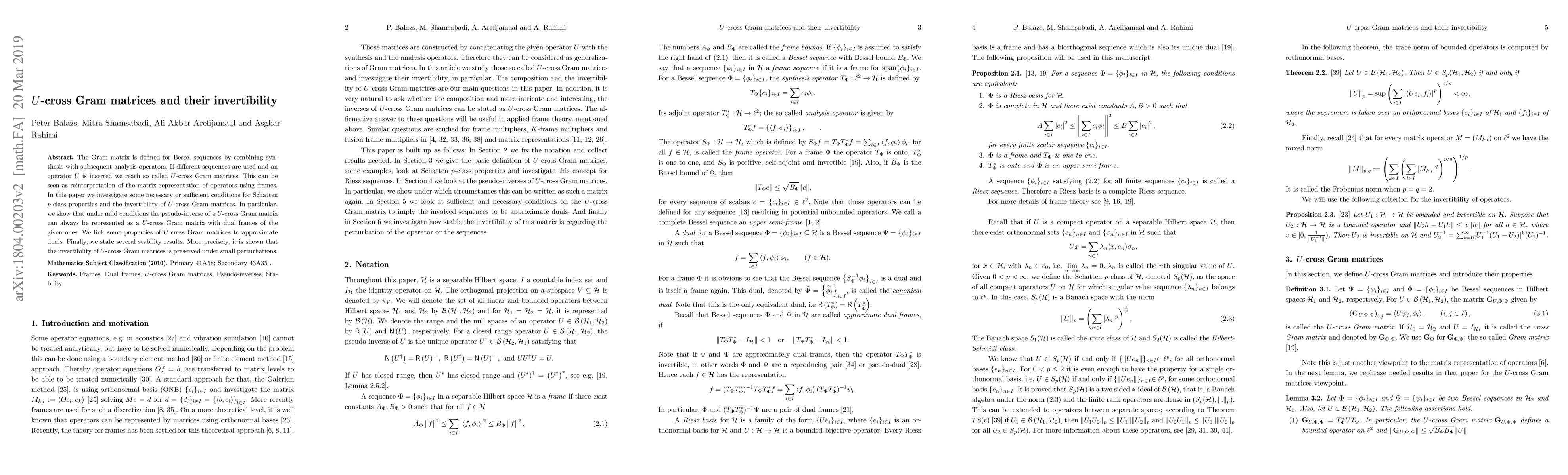 This paper explores U-cross Gram matrices derived from Bessel sequences and investigates conditions for their Schatten p-class properties and invertibility. It demonstrates that under mild conditions, the pseudo-inverse of such matrices can be represented as U-cross Gram matrices with dual frames, and establishes stability results showing invertibility preservation under small perturbations.
