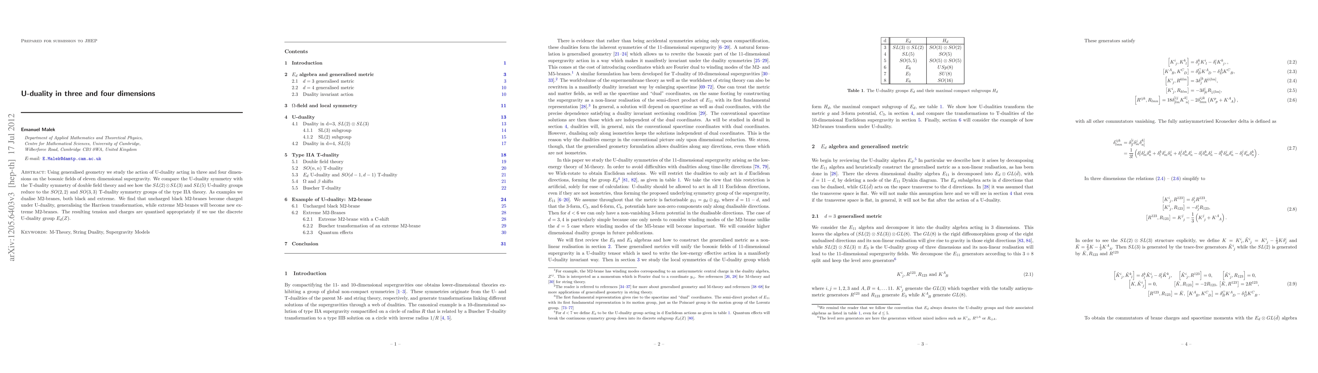This paper explores U-duality symmetries in three and four dimensions within the context of eleven-dimensional supergravity, comparing them with T-duality in type IIA theory. It finds that U-duality transformations can convert uncharged black M2-branes into charged ones, while extreme M2-branes remain extreme, with appropriate charge and tension quantisation via the $E_d(\mathbb{Z})$ U-duality group.