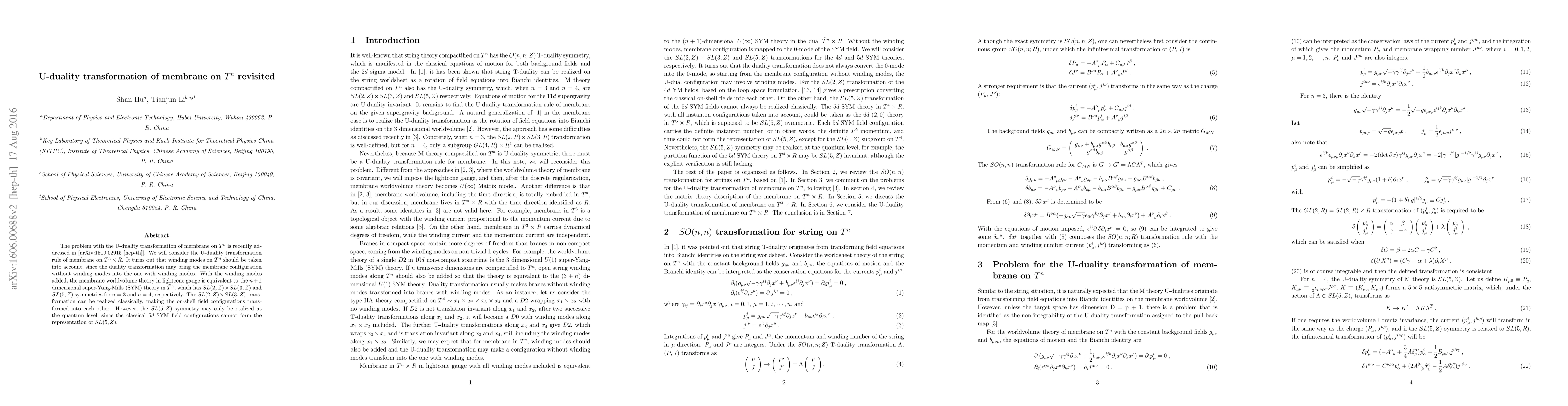 This paper revisits the U-duality transformation of membranes on $T^{n}$, emphasizing the necessity of considering winding modes. It finds that including these modes leads to an equivalence between the membrane worldvolume theory and $n+1$ dimensional super-Yang-Mills theory, revealing $SL(2,Z)\times SL(3,Z)$ and $SL(5,Z)$ symmetries depending on $n$. The $SL(2,Z)\times SL(3,Z)$ symmetry can be realized classically, while $SL(5,Z)$ symmetry is quantum-level specific.