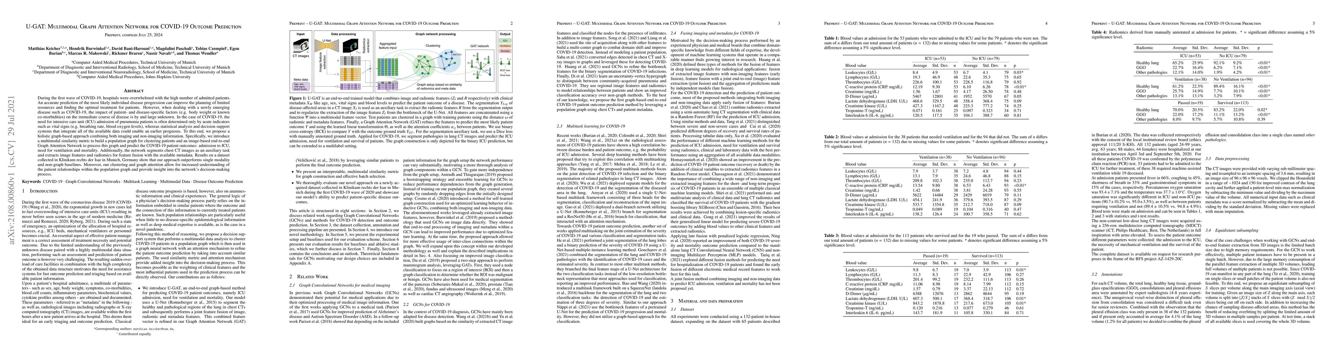 The U-GAT model integrates multimodal data, including imaging and non-imaging information, to predict COVID-19 patient outcomes using a graph attention network. The results demonstrate superior performance compared to single modality and non-graph baselines, offering insights into patient relationships and decision-making processes.