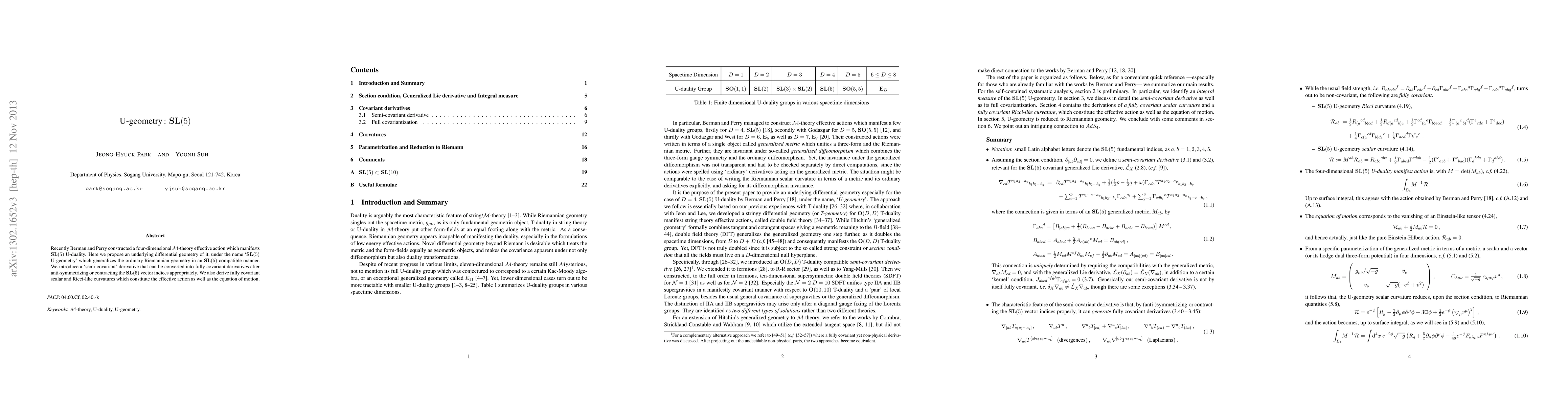 Recently Berman and Perry constructed a four-dimensional M-theory effective action which manifests SL(5) U-duality. Here we propose an underlying differential geometry of it, under the name `SL(5) U-geometry' which generalizes the ordinary Riemannian geometry in an SL(5) compatible manner. We introduce a `semi-covariant' derivative that can be converted into fully covariant derivatives after anti-symmetrizing or contracting the SL(5) vector indices appropriately. We also derive fully covariant scalar and Ricci-like curvatures which constitute the effective action as well as the equation of motion.