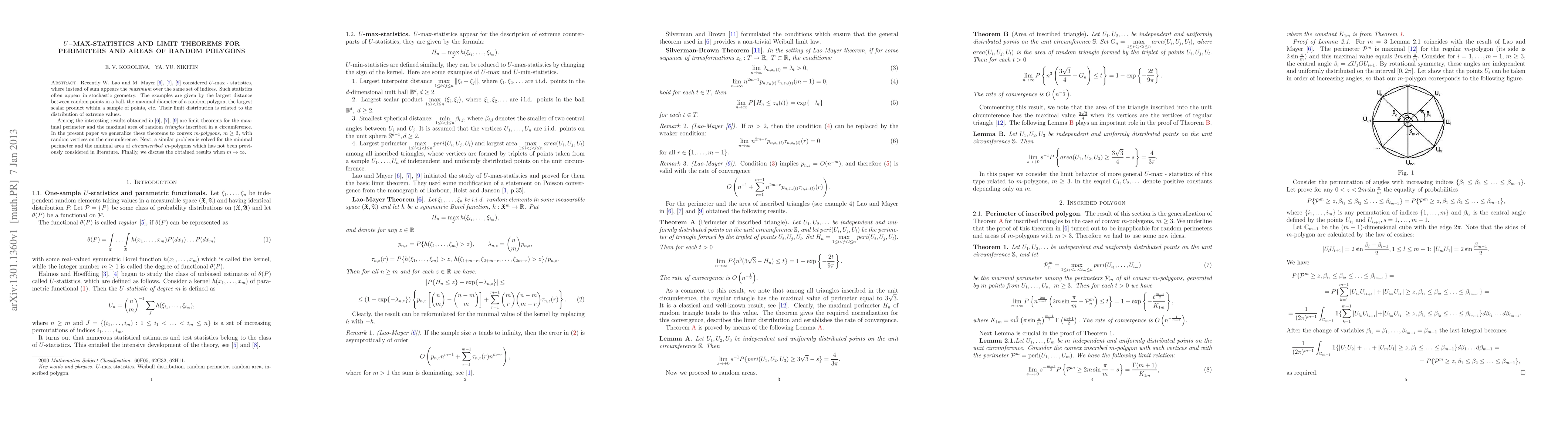 This paper generalizes limit theorems for $U$-max-statistics to convex $m$-polygons with random vertices on a circumference, extending the results for maximal perimeters and areas to minimal perimeters and areas for circumscribed $m$-polygons, and discusses the implications as $m$ approaches infinity.