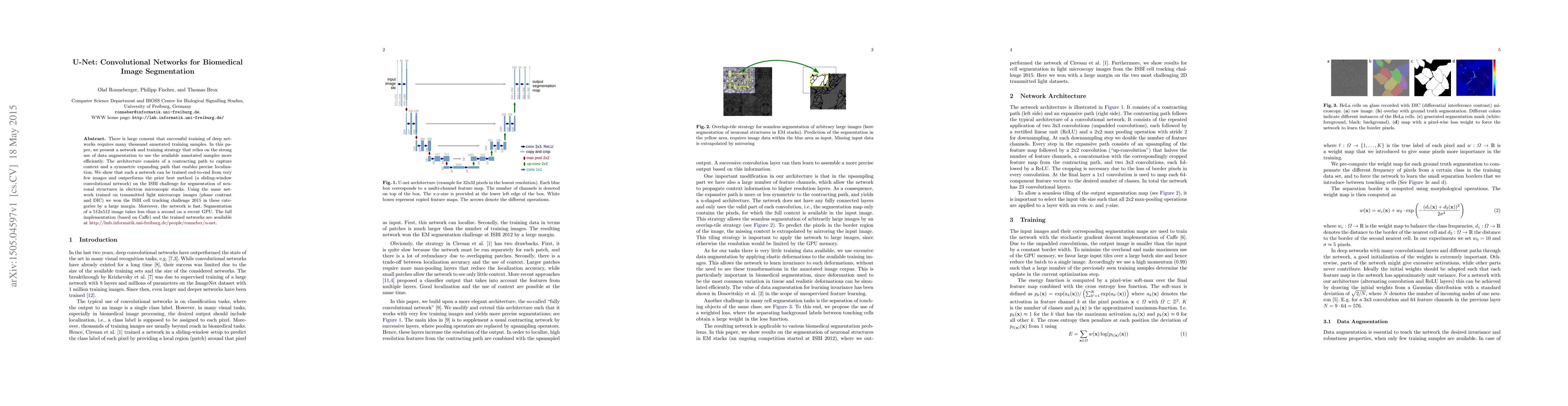 There is large consent that successful training of deep networks requires many thousand annotated training samples. In this paper, we present a network and training strategy that relies on the strong use of data augmentation to use the available annotated samples more efficiently. The architecture consists of a contracting path to capture context and a symmetric expanding path that enables precise localization. We show that such a network can be trained end-to-end from very few images and outperforms the prior best method (a sliding-window convolutional network) on the ISBI challenge for segmentation of neuronal structures in electron microscopic stacks. Using the same network trained on transmitted light microscopy images (phase contrast and DIC) we won the ISBI cell tracking challenge 2015 in these categories by a large margin. Moreover, the network is fast. Segmentation of a 512x512 image takes less than a second on a recent GPU. The full implementation (based on Caffe) and the trained networks are available at http://lmb.informatik.uni-freiburg.de/people/ronneber/u-net .