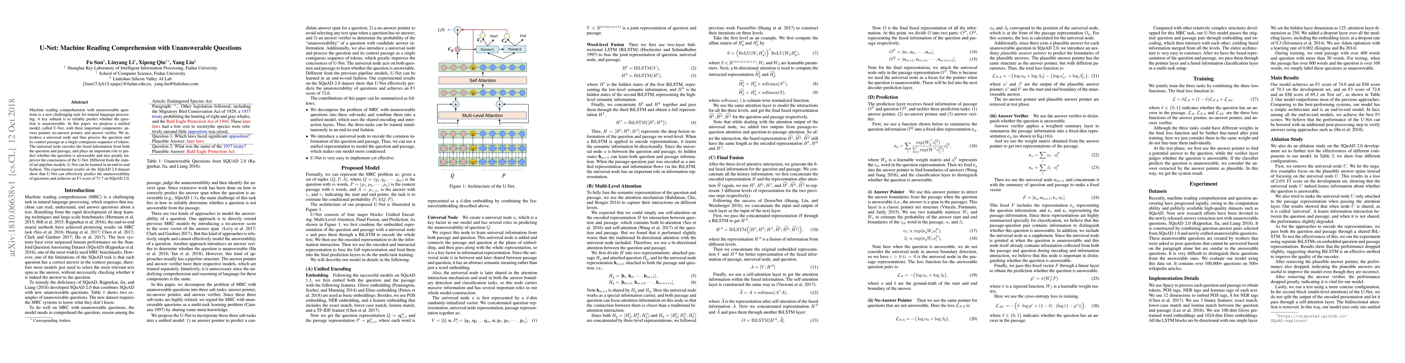 U-Net is a unified model for machine reading comprehension that predicts question unanswerability using answer pointer, no-answer pointer, and answer verifier components. It processes question and context as a single sequence, improving both prediction accuracy and model conciseness, achieving an F1 score of 71.7 on SQuAD 2.0.