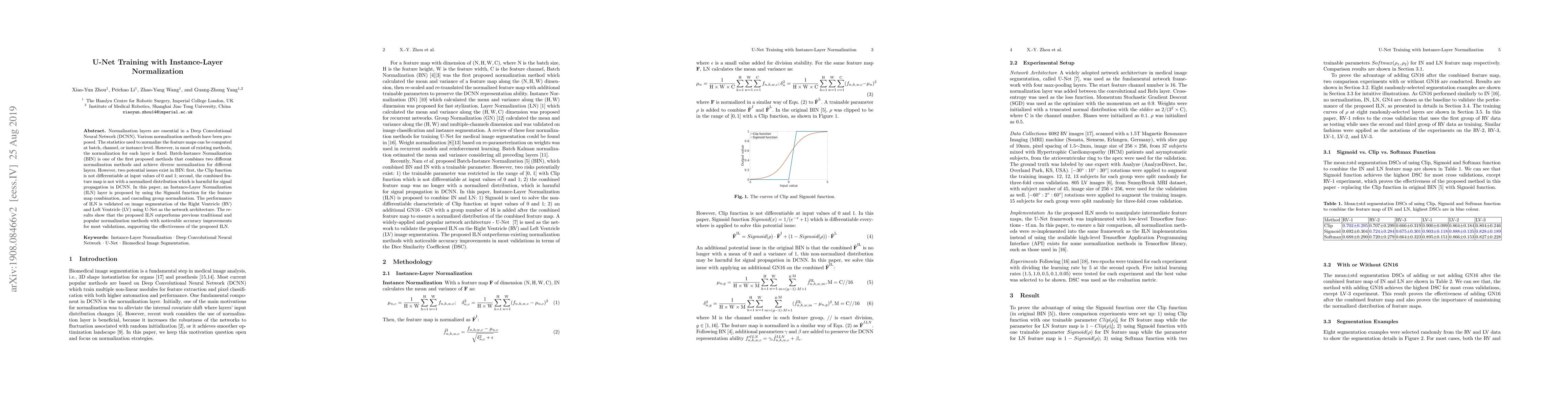 This paper proposes Instance-Layer Normalization (ILN) to enhance U-Net training, addressing issues in Batch-Instance Normalization (BIN) by using Sigmoid for feature map combination and cascading group normalization. Results show ILN outperforms traditional methods in segmenting Right Ventricle and Left Ventricle, indicating its effectiveness.