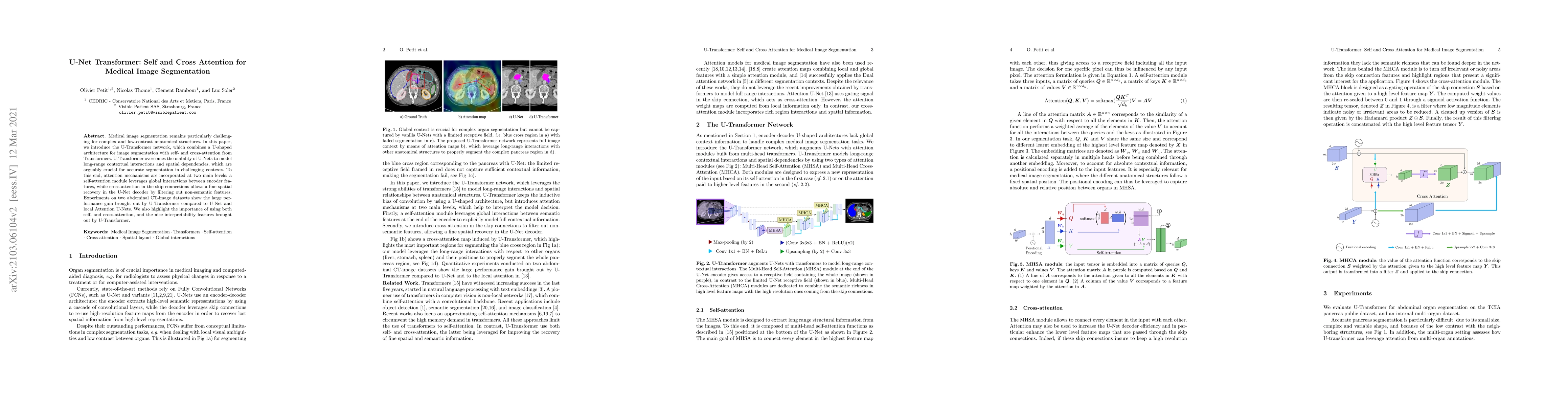 Medical image segmentation remains particularly challenging for complex and low-contrast anatomical structures. In this paper, we introduce the U-Transformer network, which combines a U-shaped architecture for image segmentation with self- and cross-attention from Transformers. U-Transformer overcomes the inability of U-Nets to model long-range contextual interactions and spatial dependencies, which are arguably crucial for accurate segmentation in challenging contexts. To this end, attention mechanisms are incorporated at two main levels: a self-attention module leverages global interactions between encoder features, while cross-attention in the skip connections allows a fine spatial recovery in the U-Net decoder by filtering out non-semantic features. Experiments on two abdominal CT-image datasets show the large performance gain brought out by U-Transformer compared to U-Net and local Attention U-Nets. We also highlight the importance of using both self- and cross-attention, and the nice interpretability features brought out by U-Transformer.