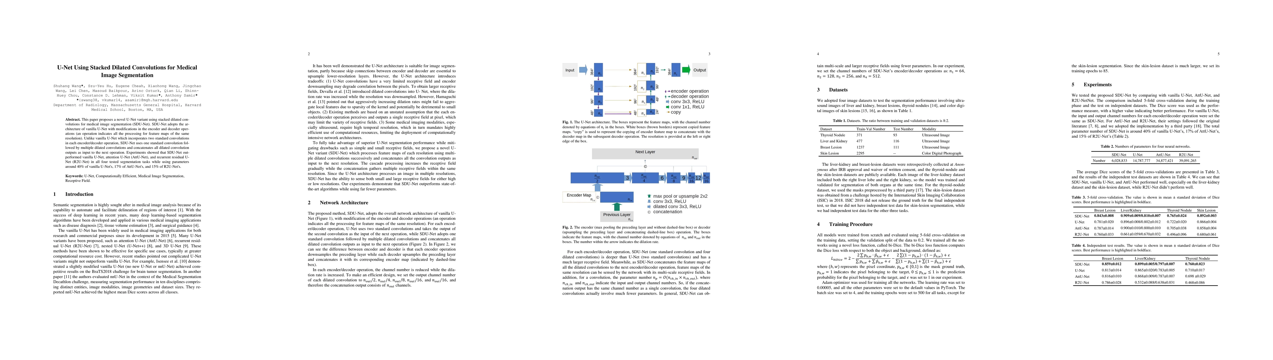 This paper introduces SDU-Net, a U-Net variant with stacked dilated convolutions for medical image segmentation, which outperforms other models while using significantly fewer parameters. SDU-Net combines standard and dilated convolutions in its encoder and decoder, achieving superior results in four segmentation tasks.