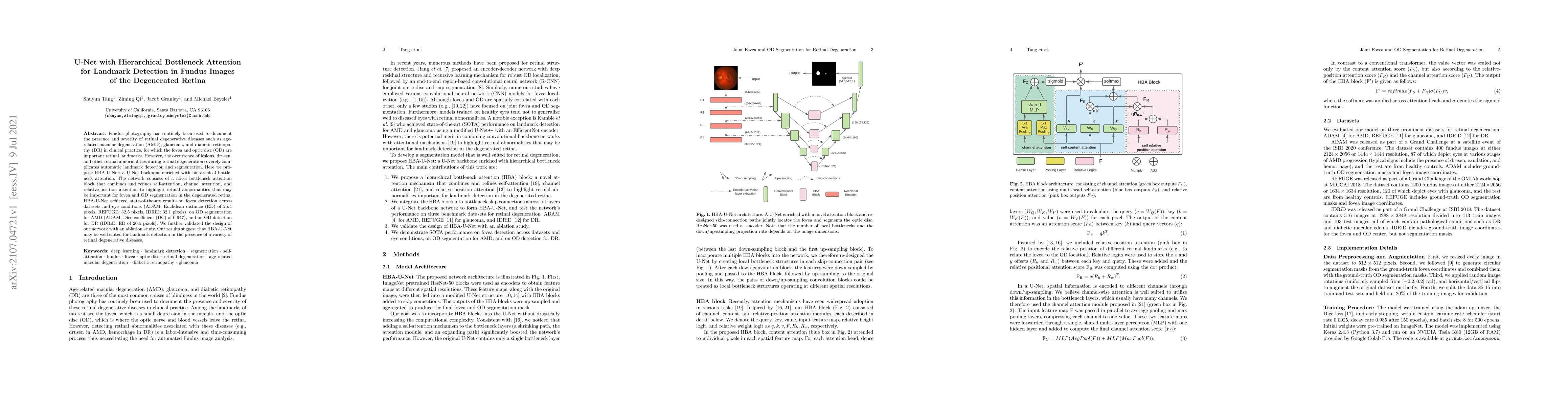 This paper proposes HBA-U-Net, a U-Net model enhanced with hierarchical bottleneck attention for detecting retinal landmarks in fundus images of degenerated retinas. The network achieves state-of-the-art results in fovea and optic disc detection across various datasets, indicating its effectiveness in handling retinal abnormalities.