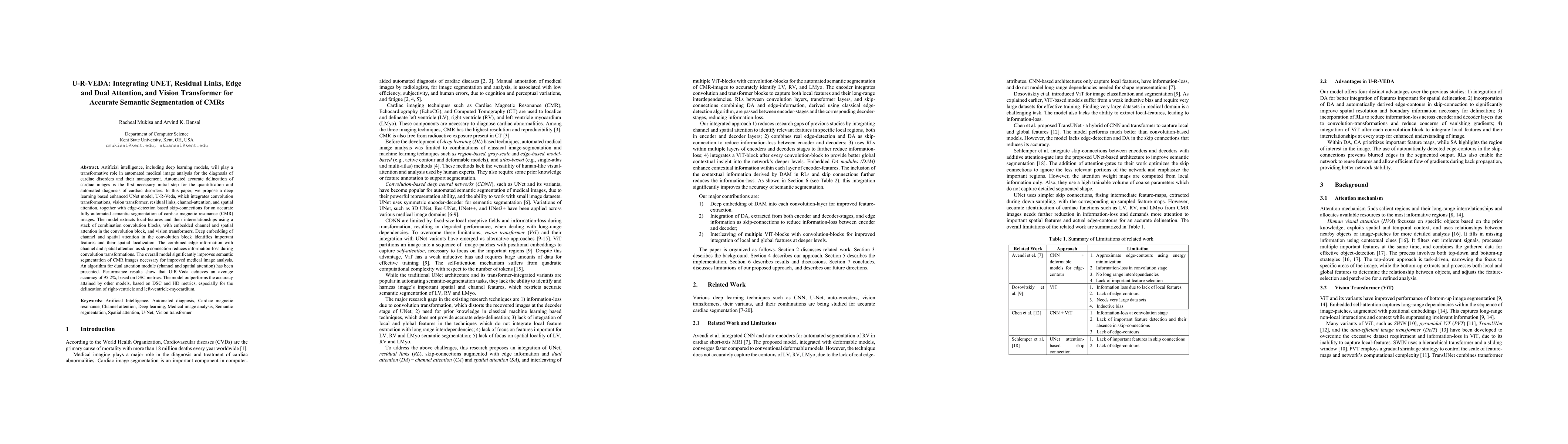 Artificial intelligence, including deep learning models, will play a transformative role in automated medical image analysis for the diagnosis of cardiac disorders and their management. Automated accurate delineation of cardiac images is the first necessary initial step for the quantification and automated diagnosis of cardiac disorders. In this paper, we propose a deep learning based enhanced UNet model, U-R-Veda, which integrates convolution transformations, vision transformer, residual links, channel-attention, and spatial attention, together with edge-detection based skip-connections for an accurate fully-automated semantic segmentation of cardiac magnetic resonance (CMR) images. The model extracts local-features and their interrelationships using a stack of combination convolution blocks, with embedded channel and spatial attention in the convolution block, and vision transformers. Deep embedding of channel and spatial attention in the convolution block identifies important features and their spatial localization. The combined edge information with channel and spatial attention as skip connection reduces information-loss during convolution transformations. The overall model significantly improves the semantic segmentation of CMR images necessary for improved medical image analysis. An algorithm for the dual attention module (channel and spatial attention) has been presented. Performance results show that U-R-Veda achieves an average accuracy of 95.2%, based on DSC metrics. The model outperforms the accuracy attained by other models, based on DSC and HD metrics, especially for the delineation of right-ventricle and left-ventricle-myocardium.