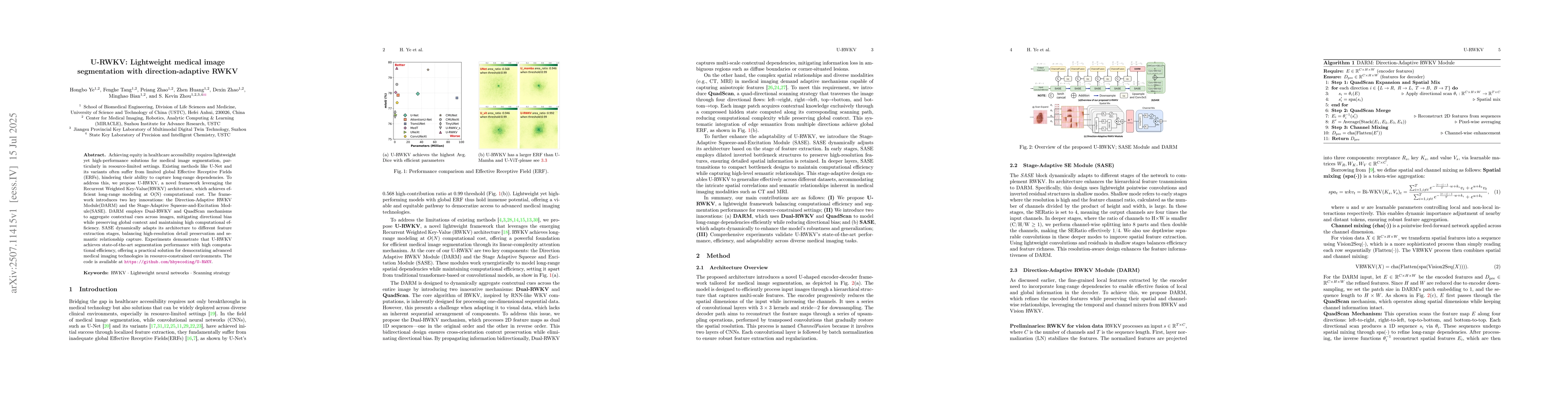 Achieving equity in healthcare accessibility requires lightweight yet high-performance solutions for medical image segmentation, particularly in resource-limited settings. Existing methods like U-Net and its variants often suffer from limited global Effective Receptive Fields (ERFs), hindering their ability to capture long-range dependencies. To address this, we propose U-RWKV, a novel framework leveraging the Recurrent Weighted Key-Value(RWKV) architecture, which achieves efficient long-range modeling at O(N) computational cost. The framework introduces two key innovations: the Direction-Adaptive RWKV Module(DARM) and the Stage-Adaptive Squeeze-and-Excitation Module(SASE). DARM employs Dual-RWKV and QuadScan mechanisms to aggregate contextual cues across images, mitigating directional bias while preserving global context and maintaining high computational efficiency. SASE dynamically adapts its architecture to different feature extraction stages, balancing high-resolution detail preservation and semantic relationship capture. Experiments demonstrate that U-RWKV achieves state-of-the-art segmentation performance with high computational efficiency, offering a practical solution for democratizing advanced medical imaging technologies in resource-constrained environments. The code is available at https://github.com/hbyecoding/U-RWKV.