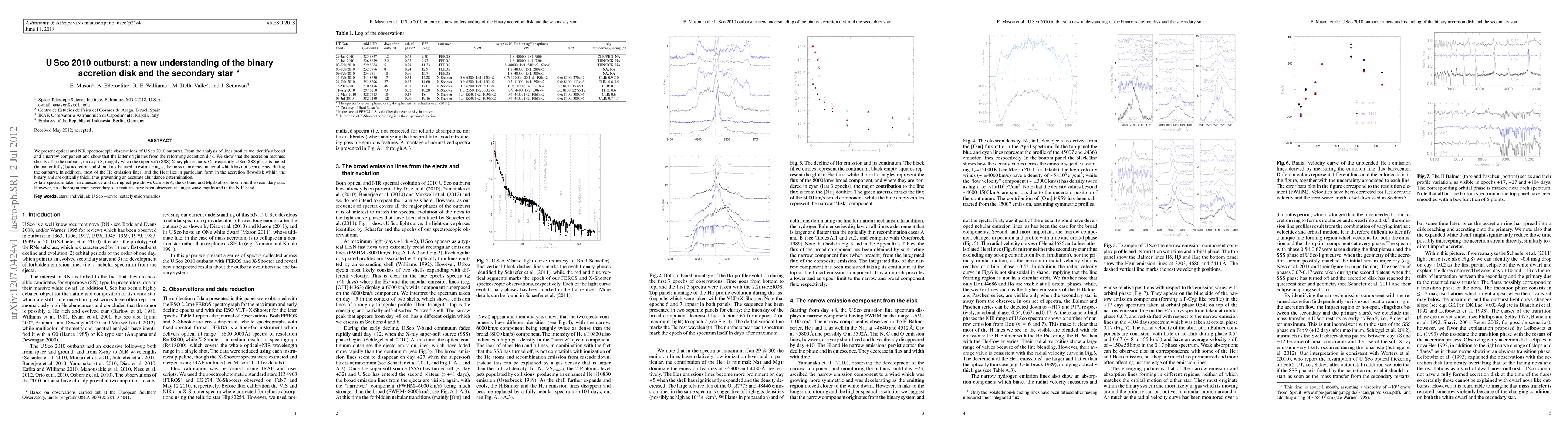 This paper analyzes U Sco 2010 outburst data, revealing that the secondary star's accretion disk reforms by day +8, fueling the super-soft X-ray phase and complicating mass estimates. Optically thick He emission lines in the accretion flow hinder accurate abundance determination.
