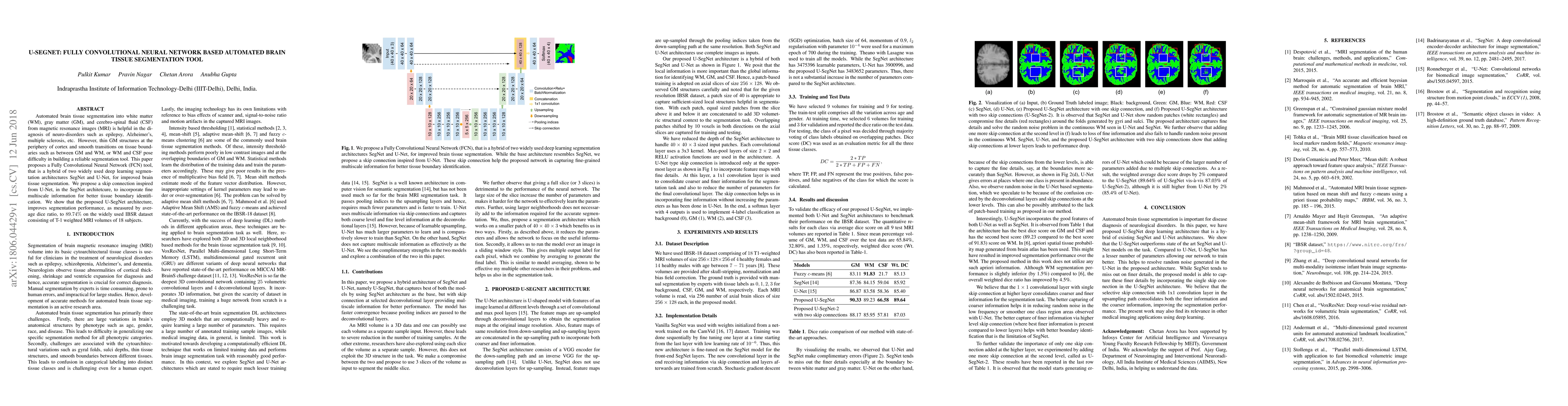 This paper introduces U-SegNet, a hybrid Fully Convolutional Neural Network combining SegNet and U-Net architectures, to enhance brain tissue segmentation in MRI scans. The proposed model, with a skip connection inspired by U-Net, achieves an average dice ratio of 89.74% on the IBSR dataset, demonstrating improved performance in segmenting white and gray matter, and cerebrospinal fluid.