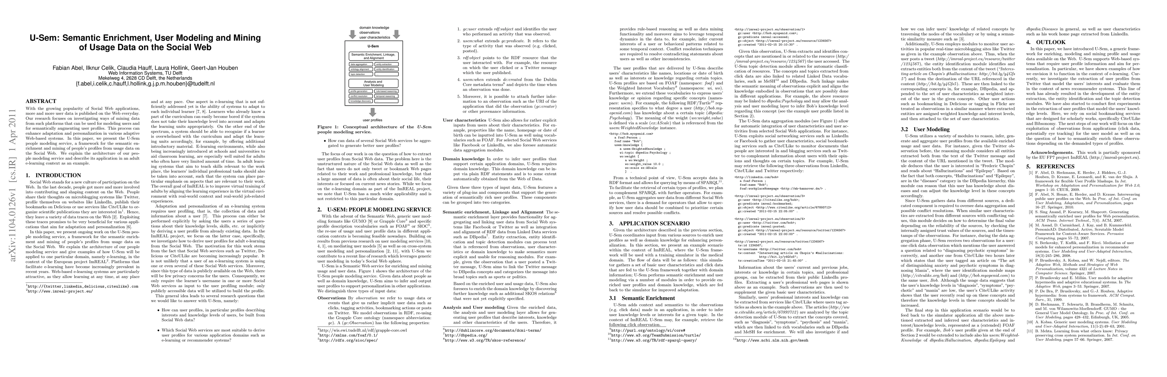 With the growing popularity of Social Web applications, more and more user data is published on the Web everyday. Our research focuses on investigating ways of mining data from such platforms that can be used for modeling users and for semantically augmenting user profiles. This process can enhance adaptation and personalization in various adaptive Web-based systems. In this paper, we present the U-Sem people modeling service, a framework for the semantic enrichment and mining of people's profiles from usage data on the Social Web. We explain the architecture of our people modeling service and describe its application in an adult e-learning context as an example. Versions: Mar 21, 10:10, Mar 25, 09:37