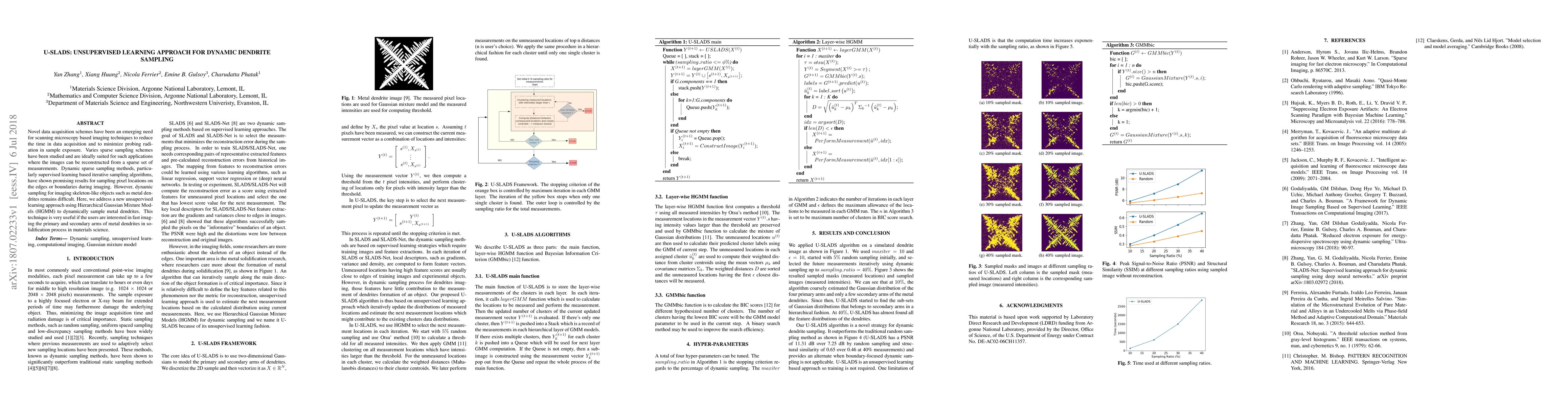 Novel data acquisition schemes have been an emerging need for scanning microscopy based imaging techniques to reduce the time in data acquisition and to minimize probing radiation in sample exposure. Varies sparse sampling schemes have been studied and are ideally suited for such applications where the images can be reconstructed from a sparse set of measurements. Dynamic sparse sampling methods, particularly supervised learning based iterative sampling algorithms, have shown promising results for sampling pixel locations on the edges or boundaries during imaging. However, dynamic sampling for imaging skeleton-like objects such as metal dendrites remains difficult. Here, we address a new unsupervised learning approach using Hierarchical Gaussian Mixture Mod- els (HGMM) to dynamically sample metal dendrites. This technique is very useful if the users are interested in fast imaging the primary and secondary arms of metal dendrites in solidification process in materials science.