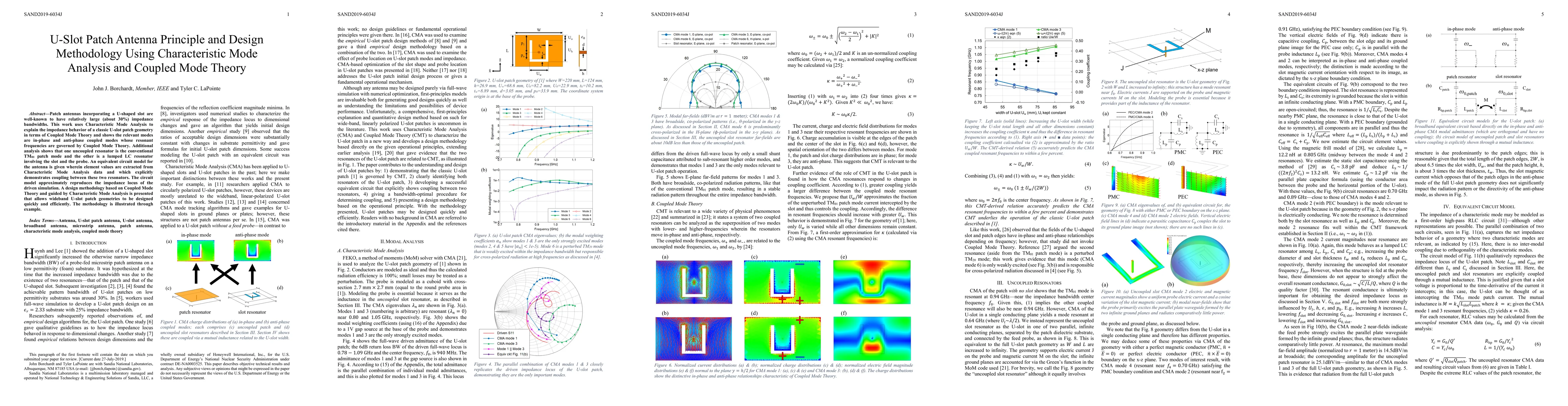 Patch antennas incorporating a U-shaped slot are well-known to have relatively large (about 30%) impedance bandwidths. This work uses Characteristic Mode Analysis to explain the impedance behavior of a classic U-slot patch geometry in terms of Coupled Mode Theory and shows the relevant modes are in-phase and anti-phase coupled modes whose resonant frequencies are governed by Coupled Mode Theory. Additional analysis shows that one uncoupled resonator is the conventional TM01 patch mode and the other is a lumped LC resonator involving the slot and the probe. An equivalent circuit model for the antenna is given wherein element values are extracted from Characteristic Mode Analysis data and which explicitly demonstrates coupling between these two resonators. The circuit model approximately reproduces the impedance locus of the driven simulation. A design methodology based on Coupled Mode Theory and guided by Characteristic Mode Analysis is presented that allows wideband U-slot patch geometries to be designed quickly and efficiently. The methodology is illustrated through example.