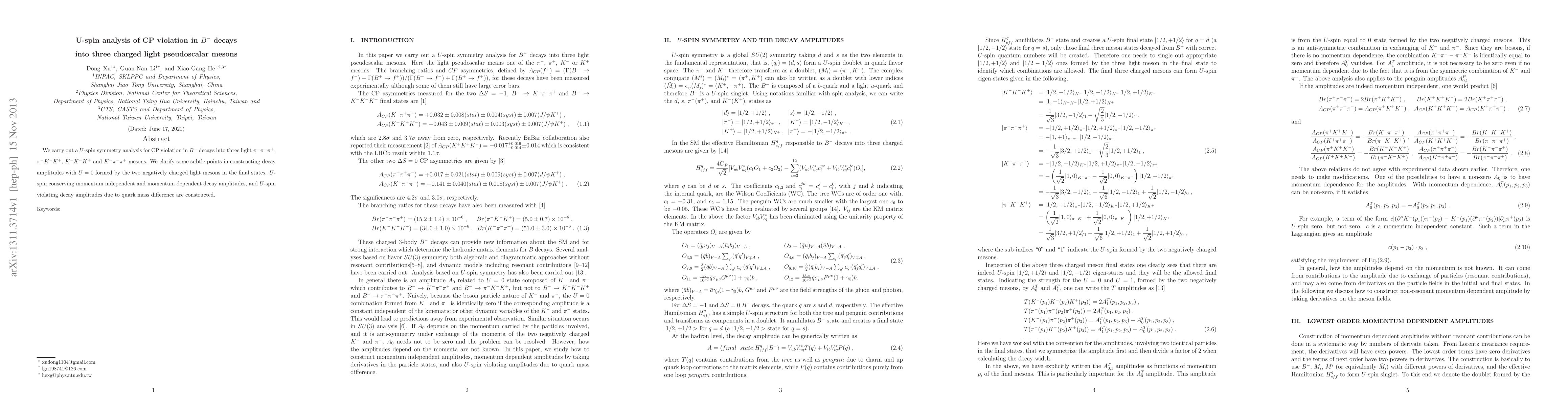 This paper analyzes CP violation in $B^-$ decays using $U$-spin symmetry, focusing on final states with three charged light pseudoscalars. It constructs $U$-spin conserving and violating decay amplitudes, clarifying the role of quark mass differences in $U$-spin violation.