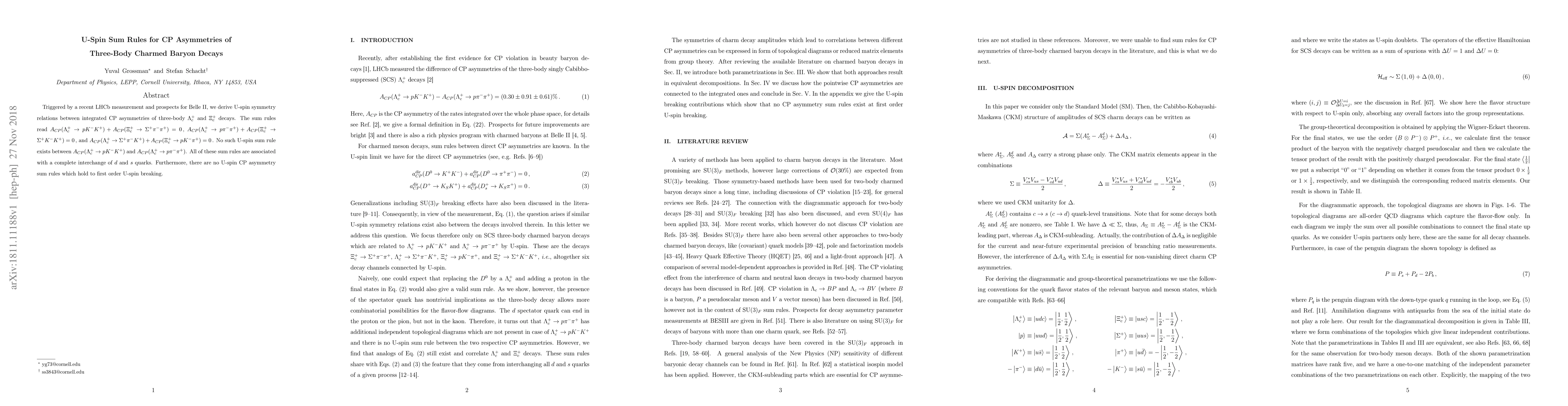 This paper derives U-spin symmetry relations for CP asymmetries in three-body decays of $\Lambda_c^+$ and $\Xi_c^+$ charmed baryons, revealing specific sum rules that equate certain CP asymmetries. The findings indicate no such relations exist for other decay channels, highlighting the significance of quark interchanges in these processes.
