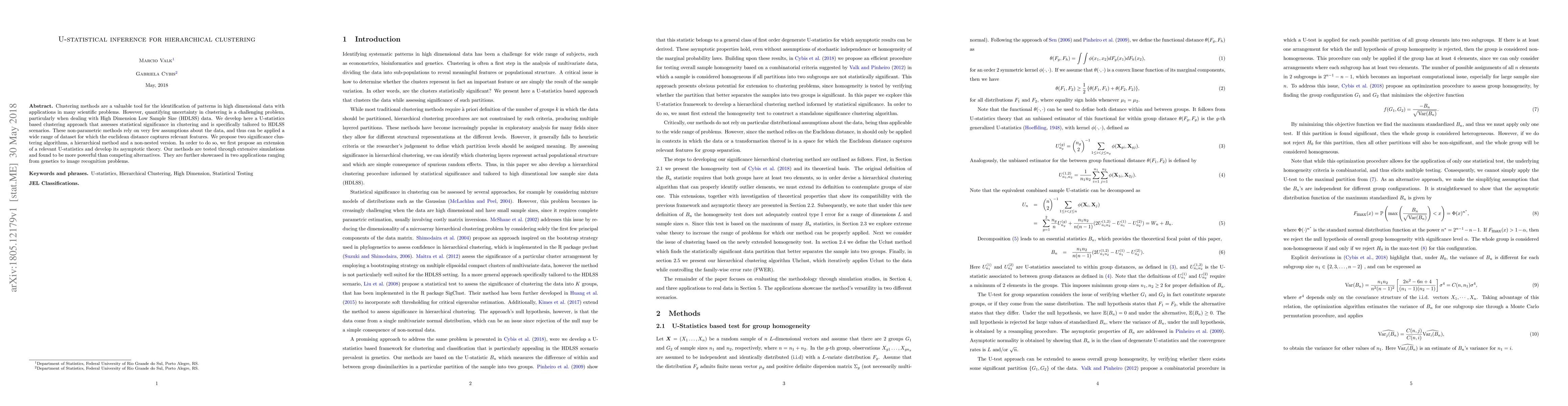 Clustering methods are a valuable tool for the identification of patterns in high dimensional data with applications in many scientific problems. However, quantifying uncertainty in clustering is a challenging problem, particularly when dealing with High Dimension Low Sample Size (HDLSS) data. We develop here a U-statistics based clustering approach that assesses statistical significance in clustering and is specifically tailored to HDLSS scenarios. These non-parametric methods rely on very few assumptions about the data, and thus can be applied to a wide range of datasets for which the euclidean distance captures relevant features. We propose two significance clustering algorithms, a hierarchical method and a non-nested version. In order to do so, we first propose an extension of a relevant U-statistics and develop its asymptotic theory. Our methods are tested through extensive simulations and found to be more powerful than competing alternatives. They are further showcased in two applications ranging from genetics to image recognition problems.